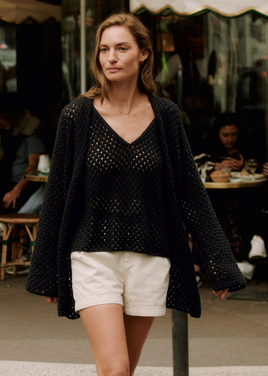 Lana Grossa-kvalitet „Dodici“ (65 % bomull, 25 % viskos, 10 % lin, löplängd = ca 110 m/50 g): ca 300 (300 - 350 - 350) g svart (färg 20); stickor nr. 4.