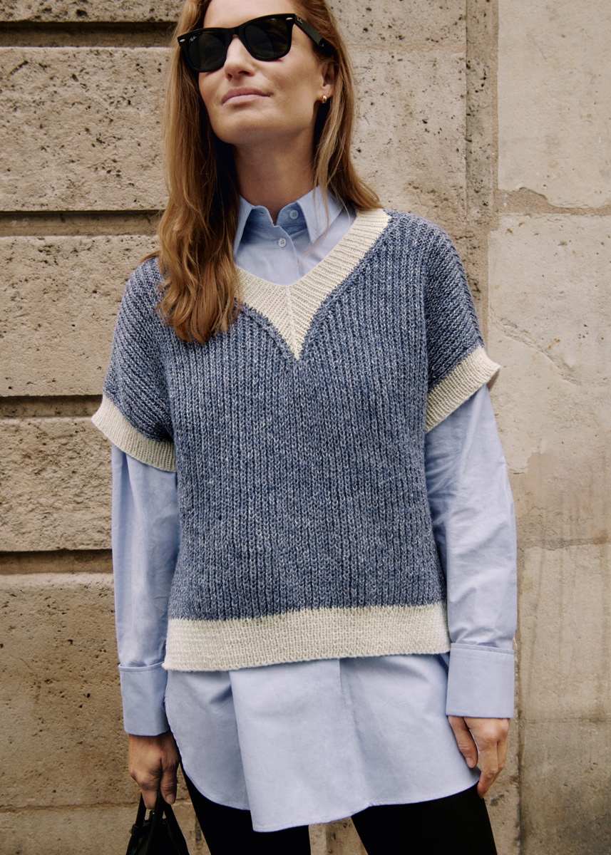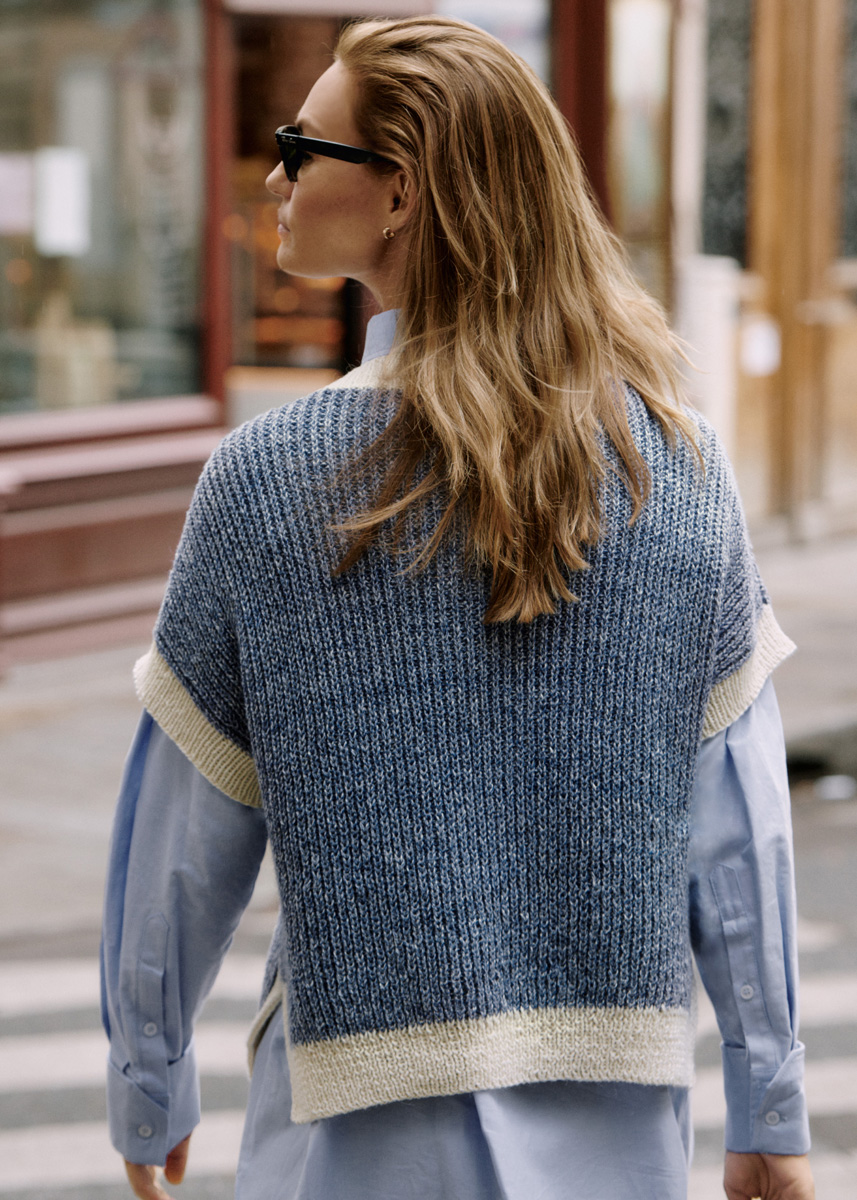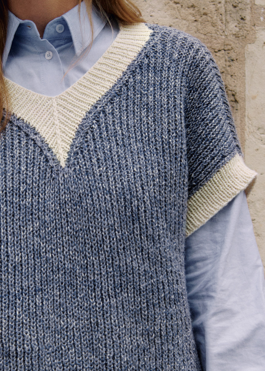 Lana Grossa-kvalitet „Cara“ (57 % alpacka (baby), 33 % bomull, 10 % ren ny ull (merino), löplängd = ca 120 m/50 g): ca 400 (400 - 450 - 500) g marin (färg 21) och ca 150 (150 - 200 - 250) g råvit (färg 1); stickor nr. 3 och nr. 3,5; 1 kort rundsticka nr. 3.