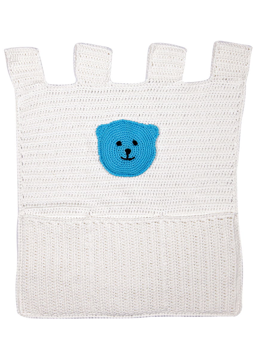 Lana Grossa-kvalitet ”Organico” (100 % bomuld, løbelængde = ca. 90 m / 50 gr.): ca. 350 gr hvid (fv 7), ”Cotone” (100 % bomuld), løbelængde = ca. 125 m / 50 gr.): 50 gr turkis (fv 9) og ”Meilenweit 100 G Merino” (75 % ren ny uld (ekstra fin merino), 25 % polyamid, løbelængde = ca. 420 m / 100 gr.): 100 gr sort (fv 2402), hæklenål nr. 3½ og 4½, fyldvat.