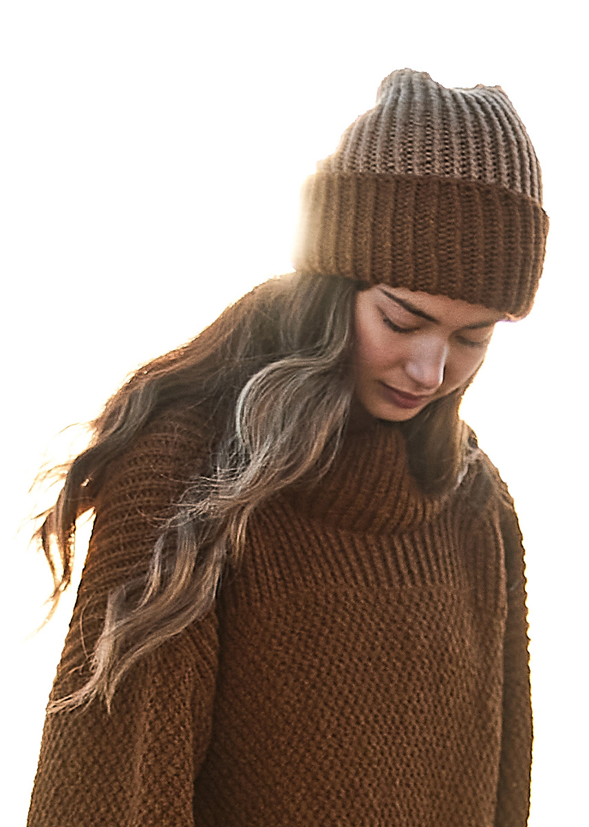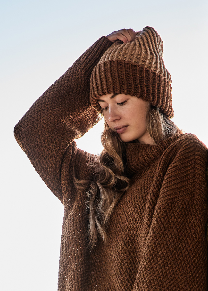 Lana Grossa-kvalitet ”Cool Merino” (90 % ren ny (merino), 10 % polyamid, løbelængde = ca. 150 m / 50 gr.): 50 gr nougat (fv 9) og 100 gr camel (fv 11), strømpepinde eller kort rundpind nr. 5.