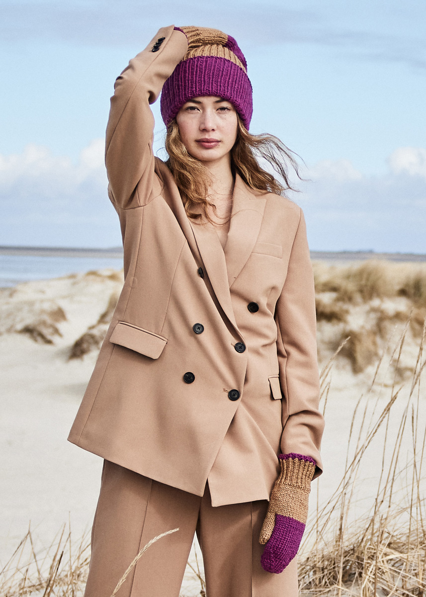 Lana Grossa-kvalitet ”Cool Merino” (90 % ren ny (merino), 10 % polyamid, løbelængde = ca. 150 m / 50 gr.): 50 gr fuchsia (fv 2) og 100 gr camel (fv 11), strømpepinde eller kort rundpind nr. 5.