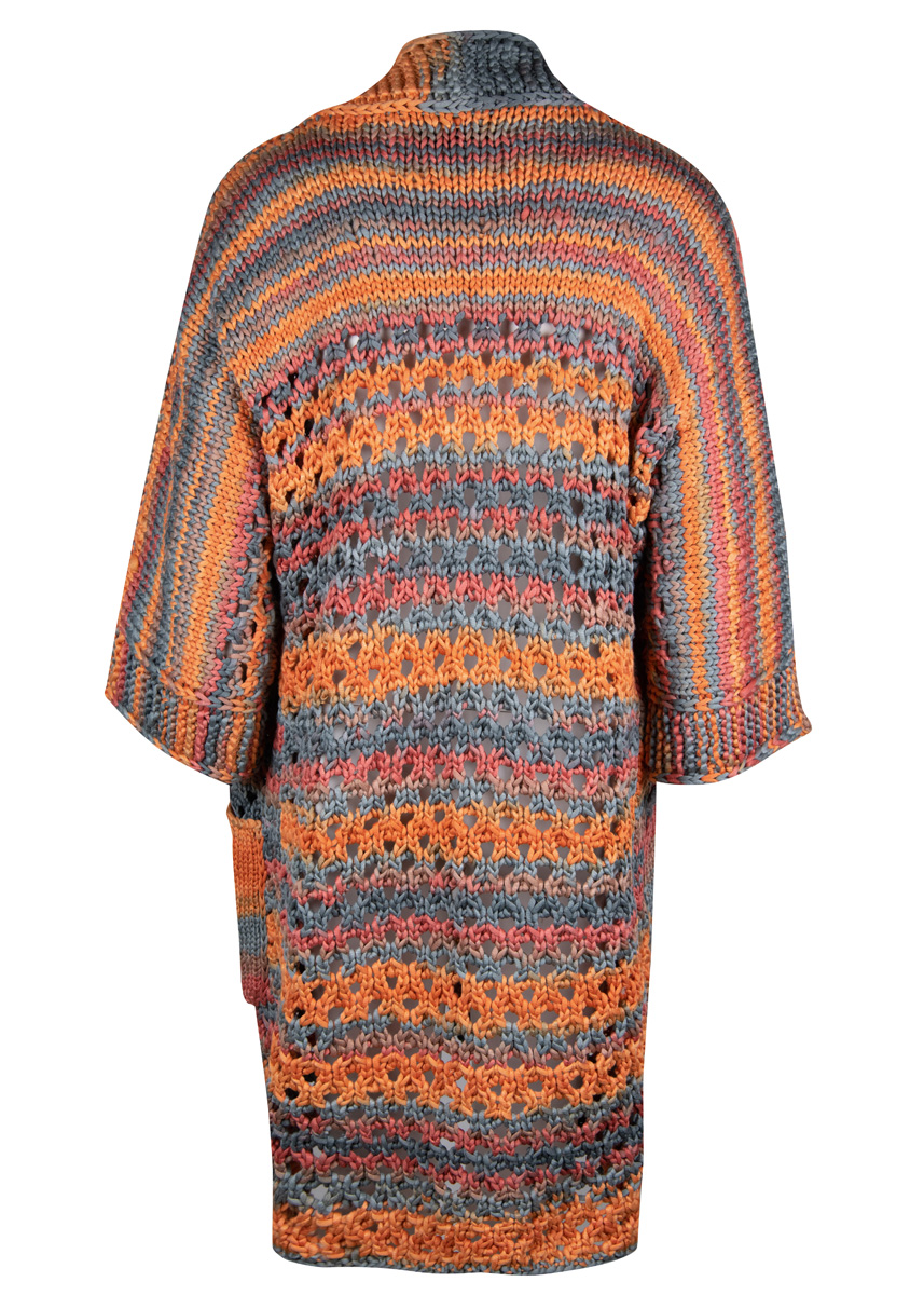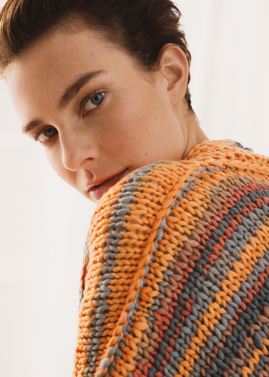 Lana Grossa „About Berlin Bulky Print“ (50% bomull, 50% micromodal; löplängd 47 m/50 g), 1100 (1250) g i mandarin/mörk grå/ljus röd/rosenträ (färg 103); stickor nr. 8.