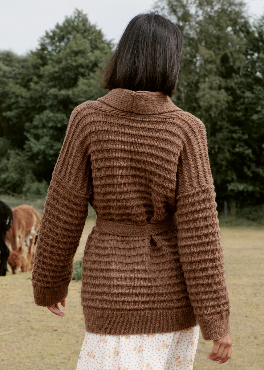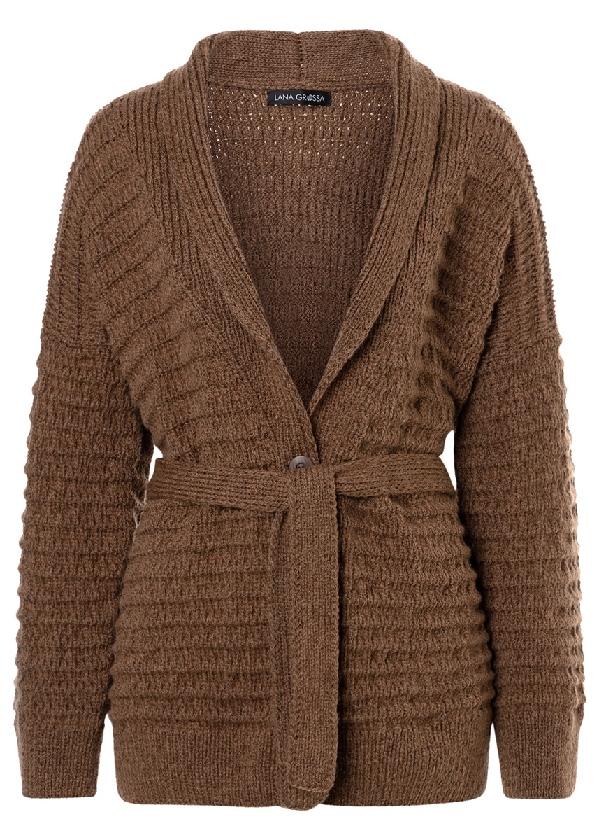 Lana Grossa-kvalitet „Alta Moda Alpaca” (90 % (baby) alpacka, 5 % ren ny ull (merino), 5 % polyamid, löplängd = ca. 140 m/50 g): ca. 1000 (1050 - 1100) g nougat (färg 92); stickor nr. 4,5 och nr. 5,5, 1 rundsticka nr. 4,5, 40 cm lång, 1 virknål nr. 4; 3 knappar från Union Knopf, 23 mm Ø, i brun färg 22, art. 0038564.