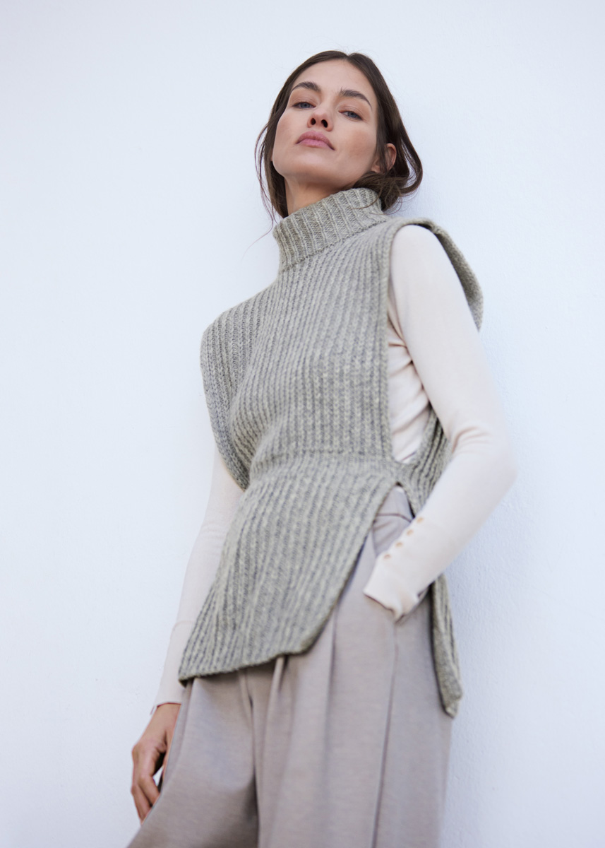 Garn: Cool Merino fra Lana Grossa (90 % ren (merinoull), 10 % polyamid, LL = ca. 150 m/50 g): ca. 300 (300 - 350 - 350) g lys grå (frg nr. 13) Pinner: Nr. 4,5 og 6 og kort rundp nr. 4,5 Heklenål: Nr. 4 til hemper om ønskelig Tilbehør: 2 knapper om ønskelig