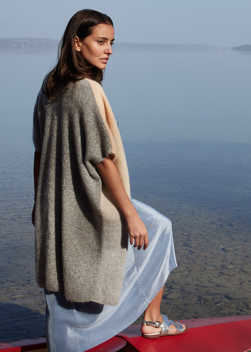 Lana Grossa-kvalitet ”Cool Wool Lace hand-dyed” (100 % ren ny ekstrafin (merino), løbelængde = ca. 800 m / 100 gr.): 200 gr Sonam (fv 804), Lana Grossa-kvalitet ”Cool Wool Lace” (100 % ren ny ekstrafin (merino), løbelængde = ca. 400 m / 50 gr.): 200 gr khaki (fv 7) og Lana Grossa-kvalitet ”Silkhair” (70 % (superkid) mohair, 30 % silke, løbelængde = ca. 210 m / 25 gr.): ca. 150(175-200) gr råhvid (fv 52), rundpind nr. 3 og 3½, 80 cm.