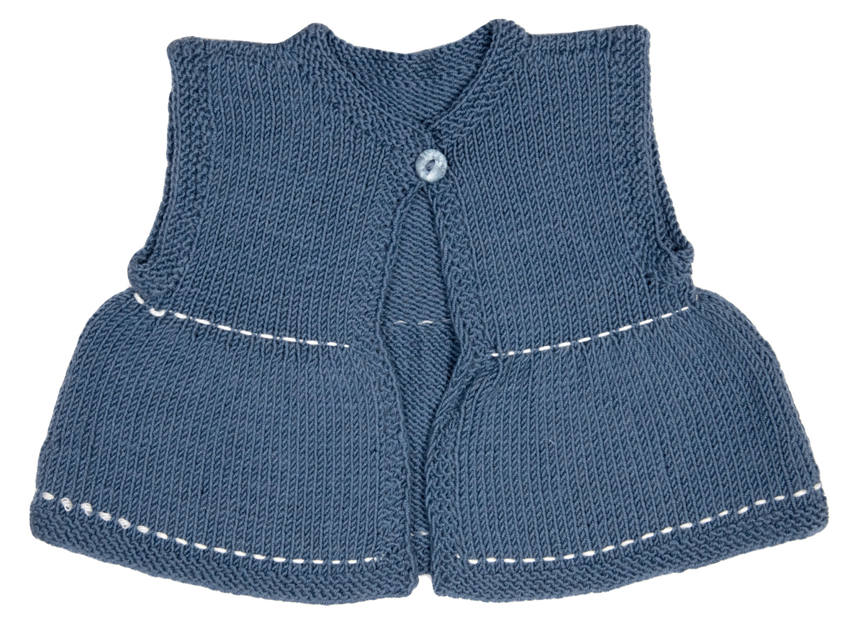 Lana Grossa-kvalitet ”Cool Wool” (100 % ren ny uld, løbelængde = ca. 160 m / 50 gr.): 100(100- 150) gr gråblå (fv 2037) og 50 gr hvid (fv 431), strikkepinde nr. 3½, rundpind nr. 3½, 40 cm, strømpepinde nr. 3½, hæklenål nr. 3, 1 knap 15 mm Ø.