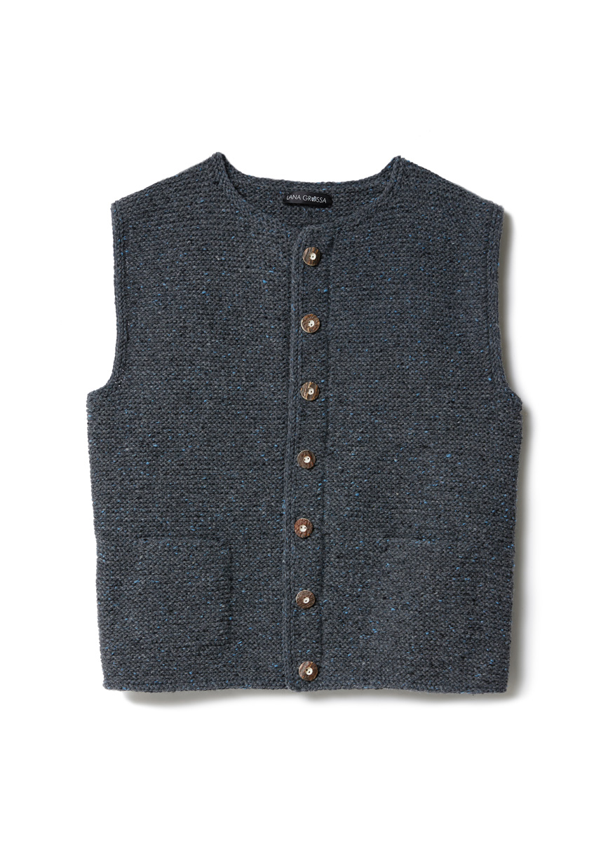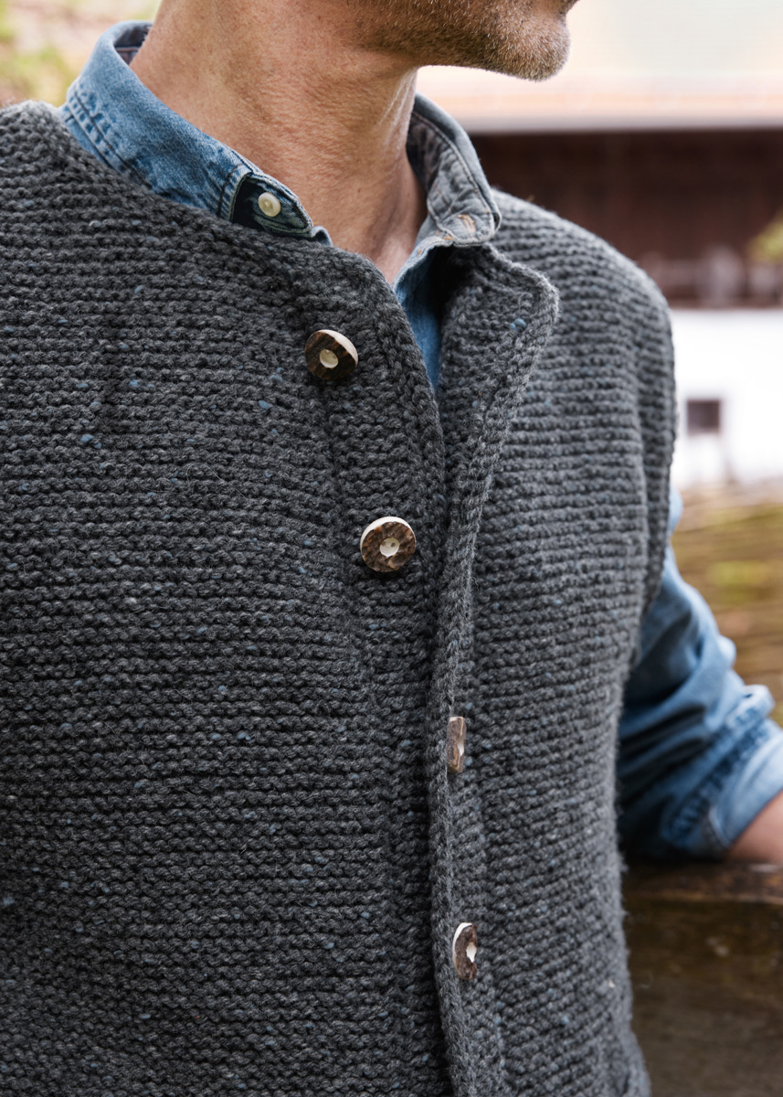Lana Grossa Landlust Soft Tweed 90 (100% Schurwolle, Lauflänge 90 m/50 g), 600 (650 – 700) g Anthrazit meliert (Fb 5); Stricknadeln Nr. 5,5 und 1 Rundstricknadel Nr. 5, 80 cm lang, sowie 7 Hirschhorn-Knöpfe von UNION KNOPF, Ø 22 mm.