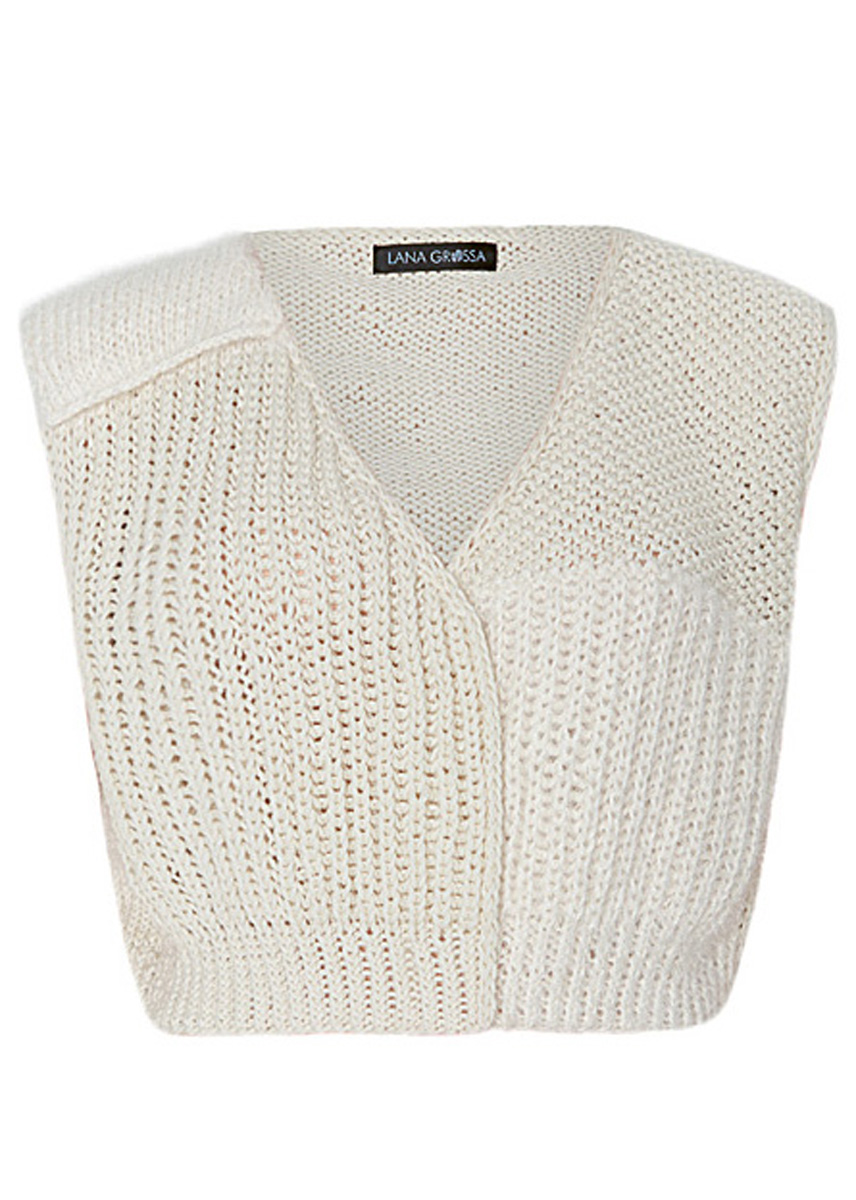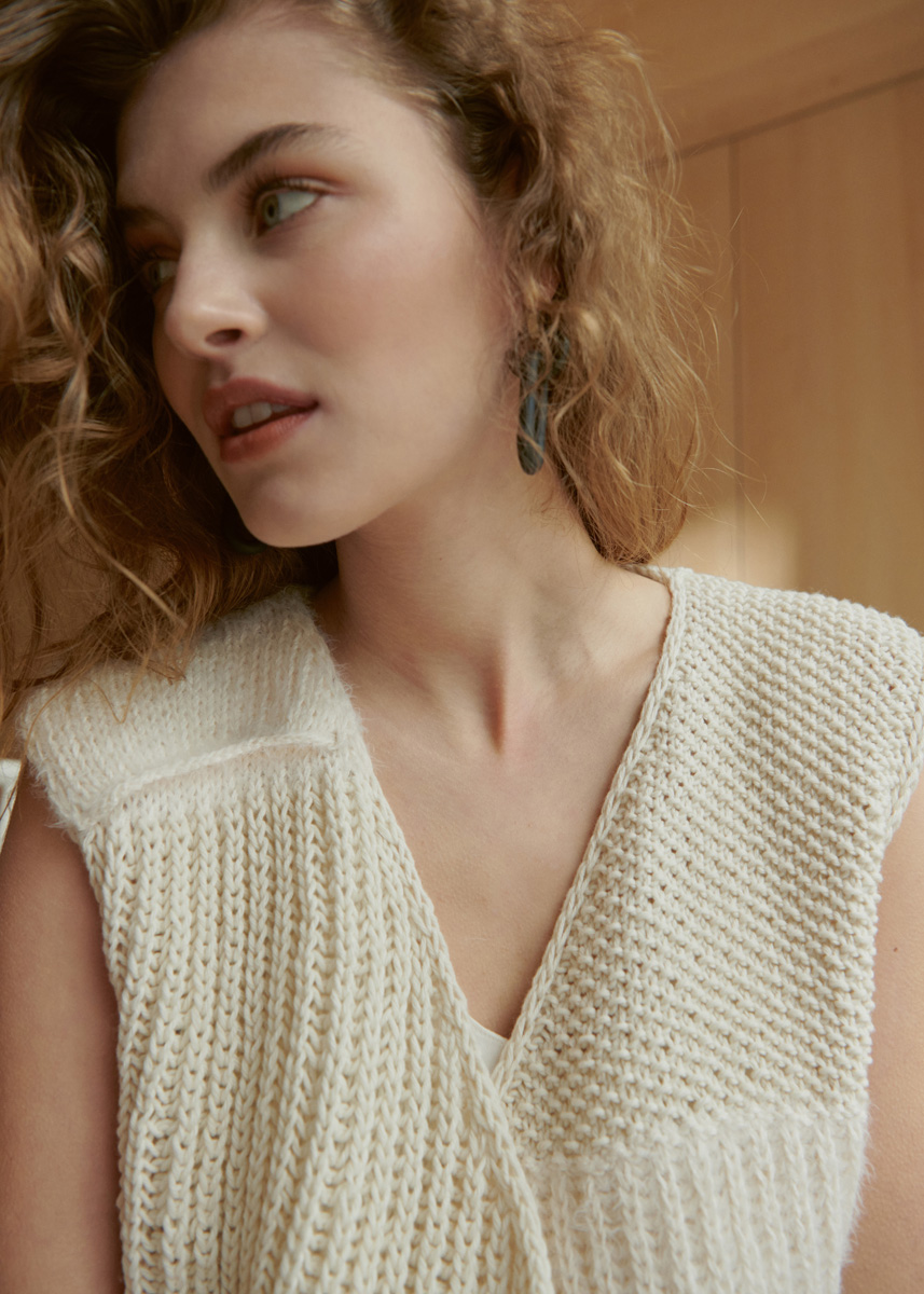 Lana Grossa-kvalitet „Fourseason“ (45 % bio ren ny ull (merino extrafin), 40 % bio bomull, 15 % återvunnen kashmir, löplängd 105 m/50 g): ca. 200 (250) g råvit (färg 12) och Lana Grossa-kvalitet „Per Fortuna“ (74 % bio bomull, 26 % polyamid, löplängd 190 m/50 g): ca. 200 (250) g ecru (färg 8); stickor nr. 6, 1 ullvirknål nr. 5.