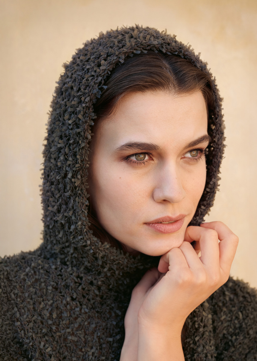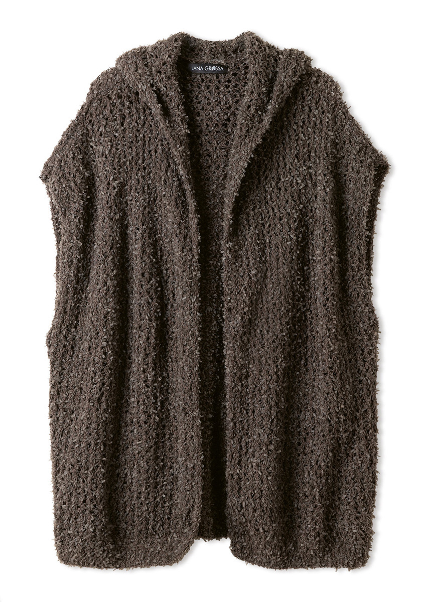 Garn: Lana Grossa «Frizzante» (54 % bomull, 46 % polyamid, LL = ca. 105 m/50 g): Ca. 400 (450 - 500 - 550) g mokka (frg 4). Pinner: Nr. 5