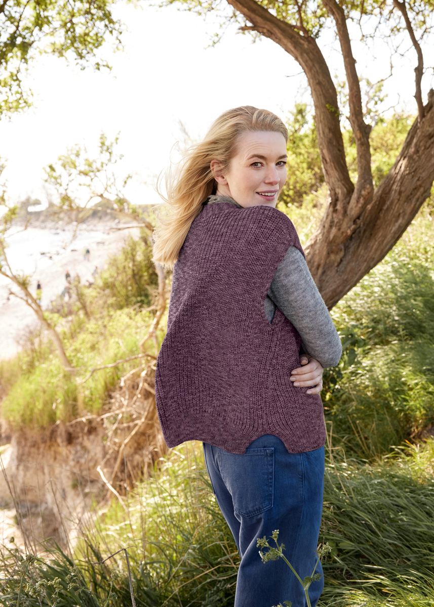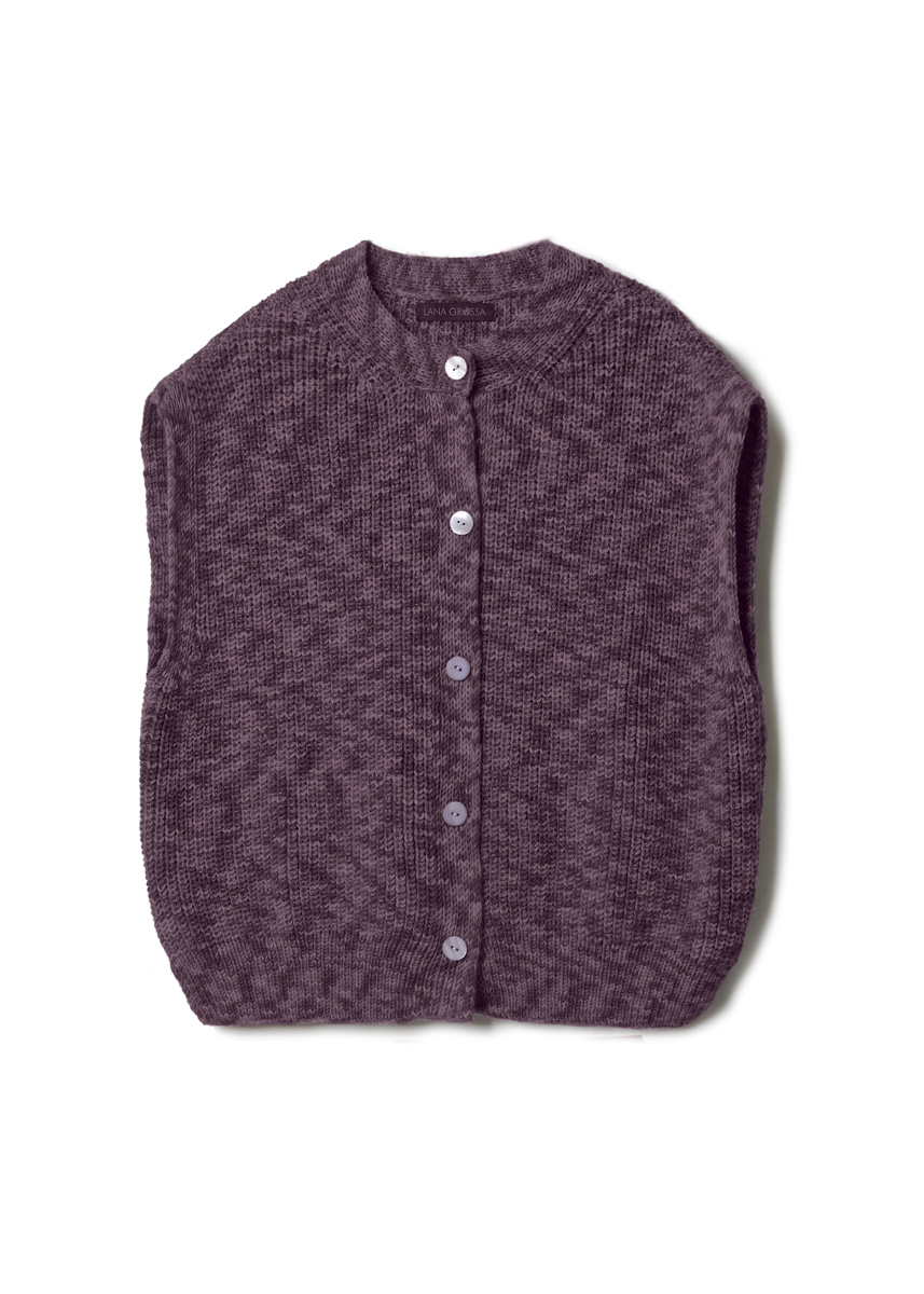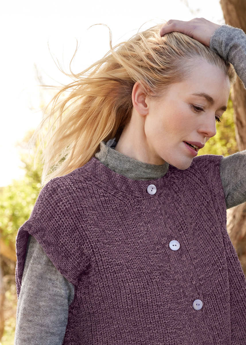 Lana Grossa Cool Wool Vintage (100 % ren ny ull (merino), LL = ca 160 m/50 g), 500 (550 – 550 – 600) g antikkfiolett (frg 7387) Pinner: Nr. 3 og 3,5 Tilbehør: Fem knapper, ca 20 mm Ø