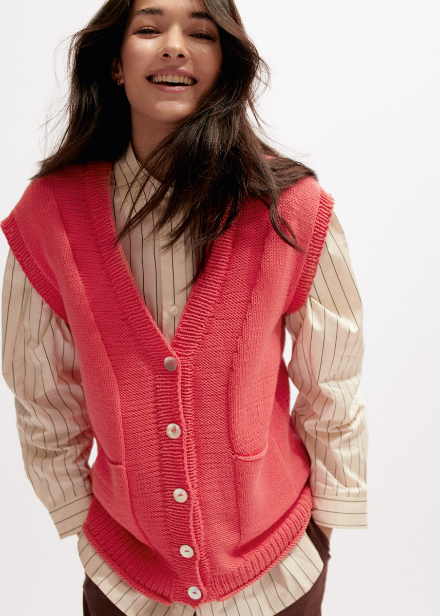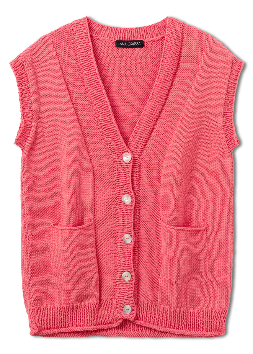 Lana Grossa Landlust bomull (100% bomull (Bio), löplängd 115 m/50 g), 400 (400 – 450) g lax (färg 20); stickor nr. 3 och 4, rundstickor nr. 3, 40 och 100 cm lång, och 5 knappar från UNION KNOPF, Art. 46286, färg 12, Ø 20 mm.