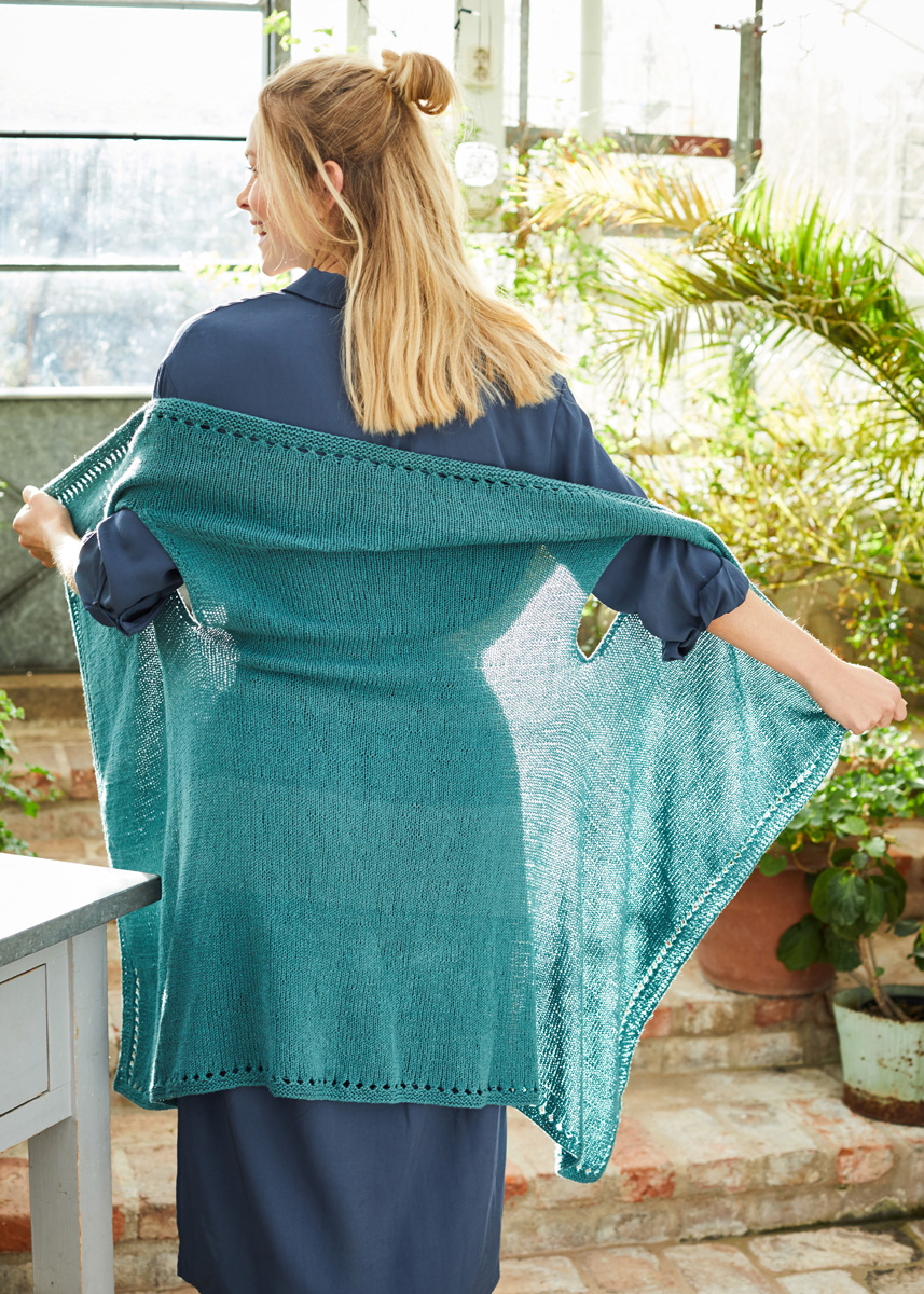 Lana Grossa-kvalitet „Landlust Sommerseide“ (50% silke, 50% bomull, löplängd ca. 170 m/50 g), 400 (450) g mörk grön (färg 4); 1 lång rundsticka nr. 4, 1 virknål nr. 3,5.