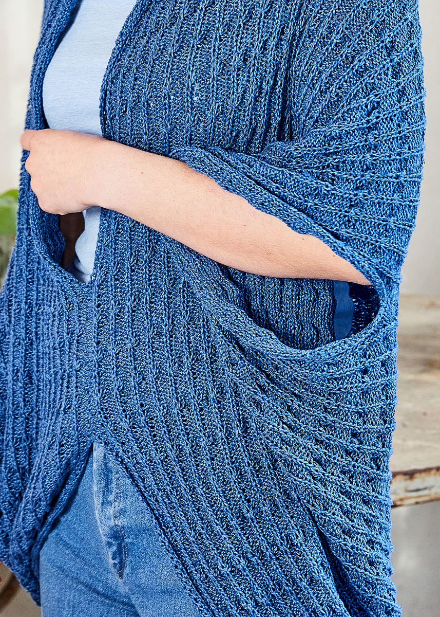 Lana Grossa-kvalitet „Landlust Sommerseide“ (50% silke, 50% bomull, löplängd ca. 170 m/50 g), 550 g i marine (färg 7); 1 rundsticka nr. 4, 80 cm lång, 1 virknål nr. 4,5.