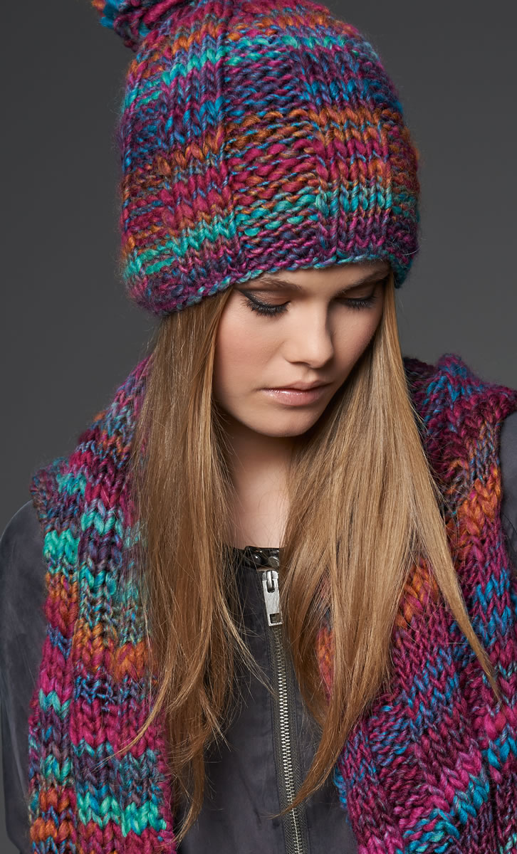 Lana Grossa-kvalitet „Olympia“ (53 % ren ny uld, 47 % polyakryl, løbelængde = ca. 100 m / 100 gr.): ca. 500 gr. cyklamen/bordeaux/turkis/orange/petrol (fv. 37), strikkepinde nr. 12, en hæklenål nr. 6