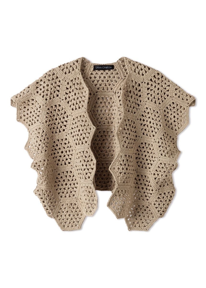 Garn: Lana Grossa «Promessa» (70 % bomull (bio), 30 % polyamid (resirkulert), LL = ca. 125 m/50 g): Ca. 400 til 450 g gråbeige (frg 15). Heklenål: Nr. 4