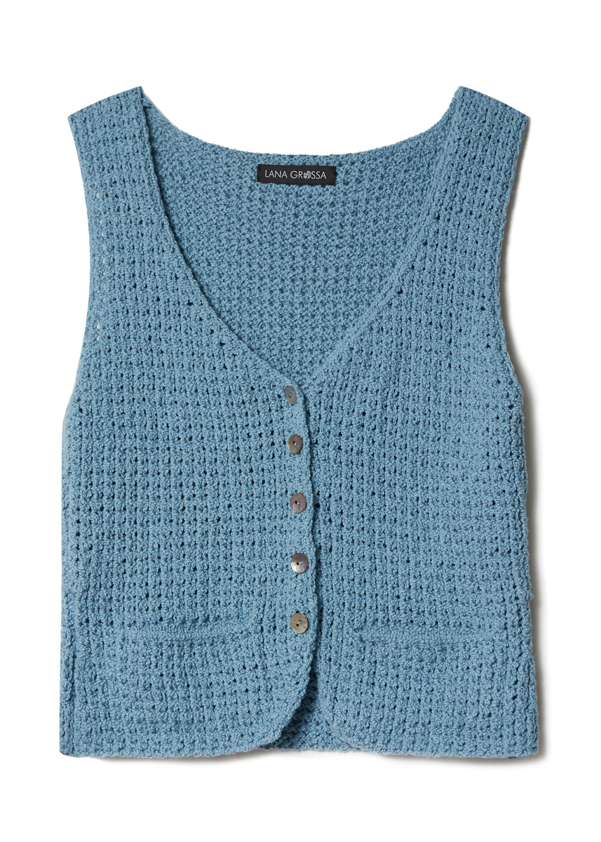 Lana Grossa-kvalitet „Riccio“ (84 % bomull, 16 % polyamid, löplängd = ca 110 m/50 g): ca 200 (200 - 250 - 300) g gråblå (färg 5); stickor nr 5 och nr 5,5; 5 pärlemorknappar, färg 76, 15 mm diameter, artikel-nr 46286 från Union Knopf.