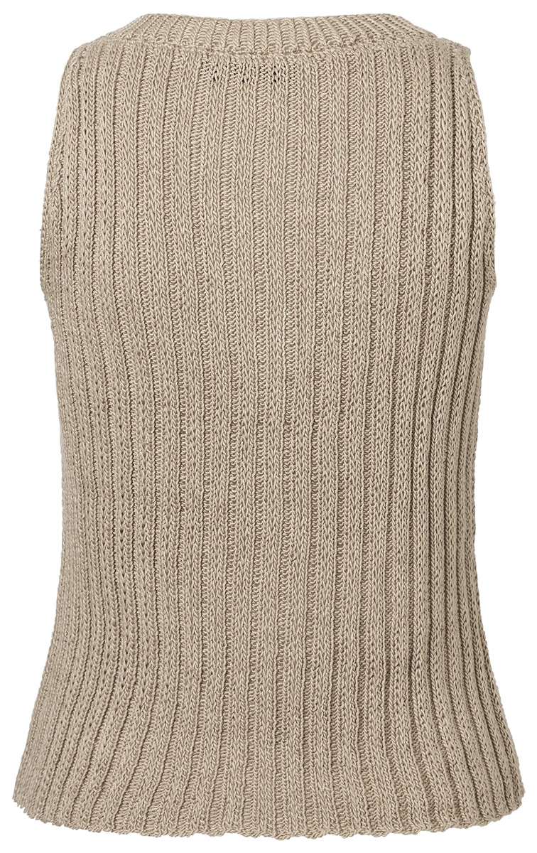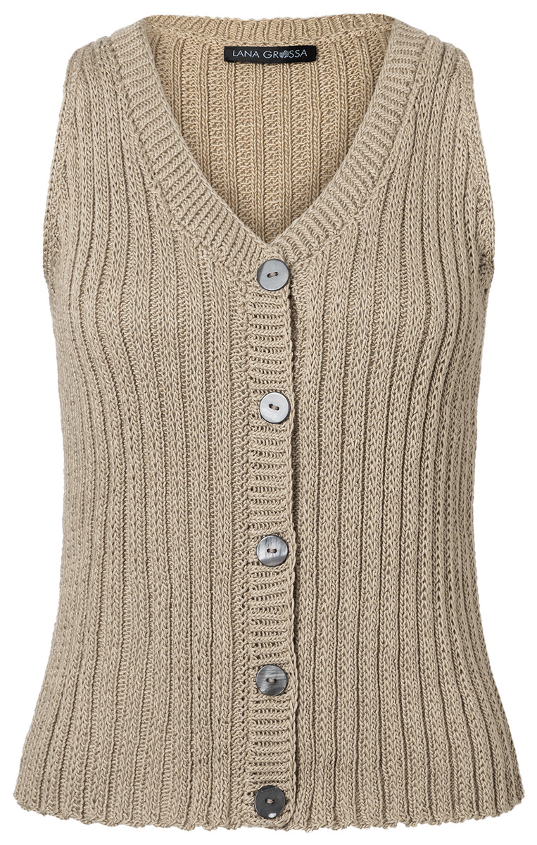 Lana Grossa Solo Lino (80% återvunnen lin (viskos), 20% lin, löplängd 120 m/50 g), 350 (400 – 400) g beige (färg 21); stickor nr. 3,5 och 1 rundsticka nr. 3, 80 cm lång, 1 virknål nr. 3 och 5 knappar från UNION Knopf, Art. 453037, färg 78, storlek 20 mm.