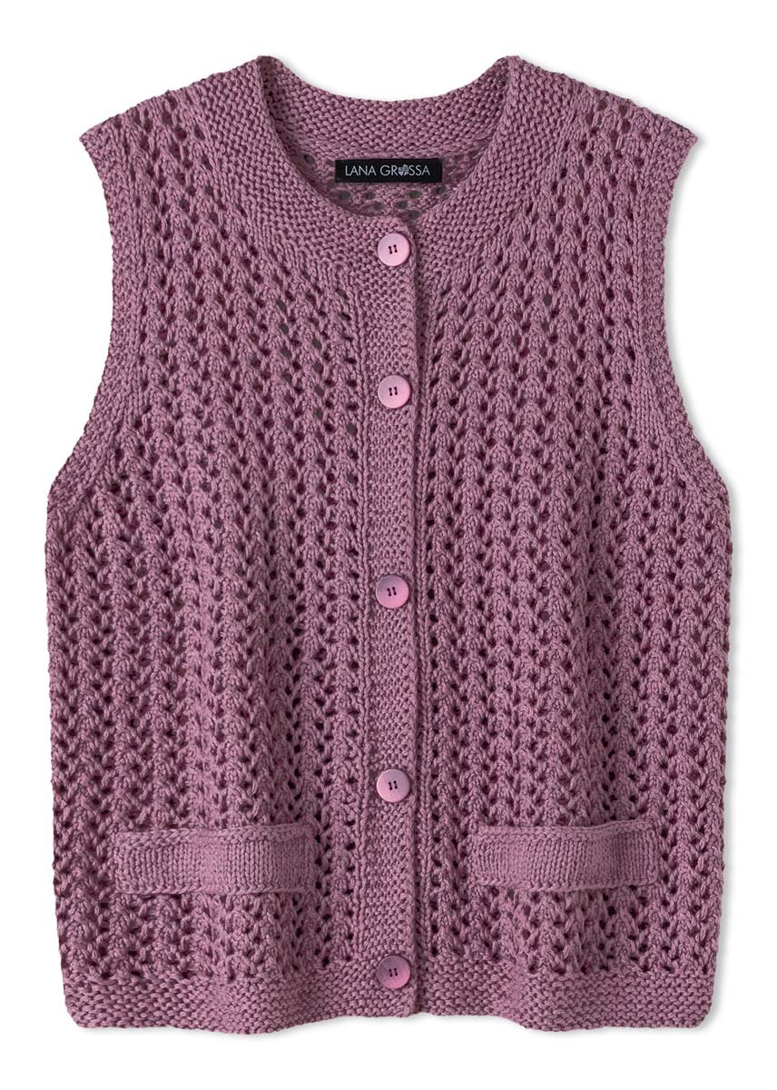 Lana Grossa Summer Cashmere (90% bomull, 10% kasjmir, løpelenge 210 m/50 g), 300 (350 – 400) g antikkviolett (farge 7); pinner nr. 4,5 og 1 rundpinne nr. 4,5, 60 cm lang, samt 5 knapper fra UNION KNOPF, farge antikkviolett, Ø 20 mm.