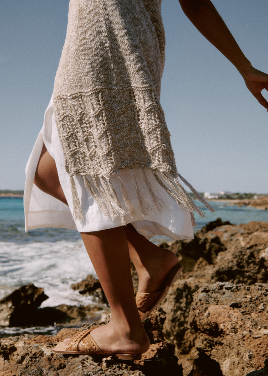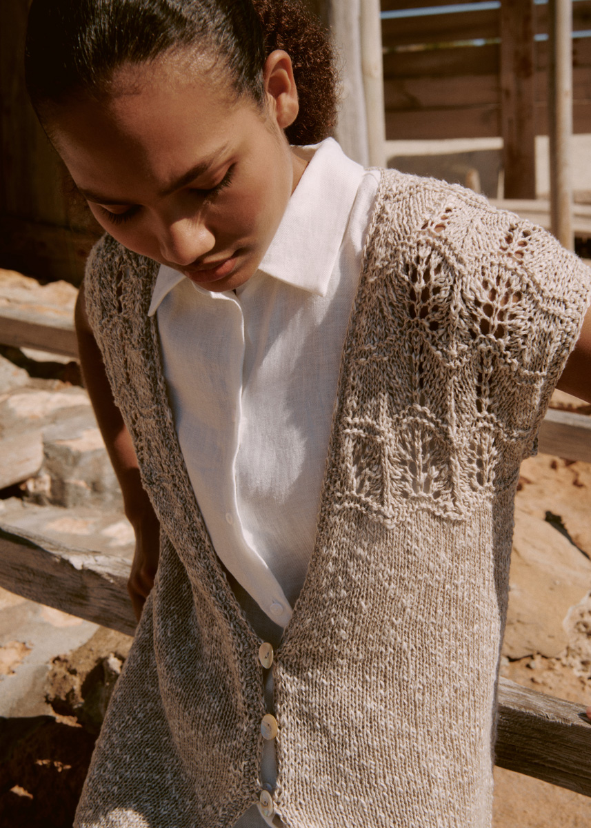 Lana Grossa-kvalitet „Terra“ (58 % hør, 42 % bomuld, løbelængde = ca. 170 m / 50 gr.): ca. 550(600) gr beige (fv 7), strikkepinde nr. 4½, hæklenål nr. 4½ og 8, 3 perlemorsknapper i natur, 20 mm Ø. Bemærk: Modellen strikkes/hækles med dobbelt garn.