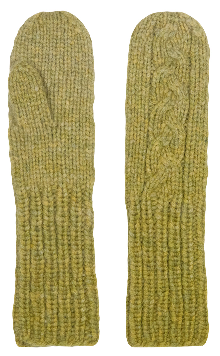 Lana Grossa „Alta Moda Cashmere 16 Sfumato“ (78% ren ny ull (merino), 12% kashmir, 10% polyamid, løpelengde ca. 220 m/100 g); 100 g i sennep/oliven melert (farge 211); settpinner nr. 6, 2 sikkerhetsnåler, flette- eller hjelpepinne.