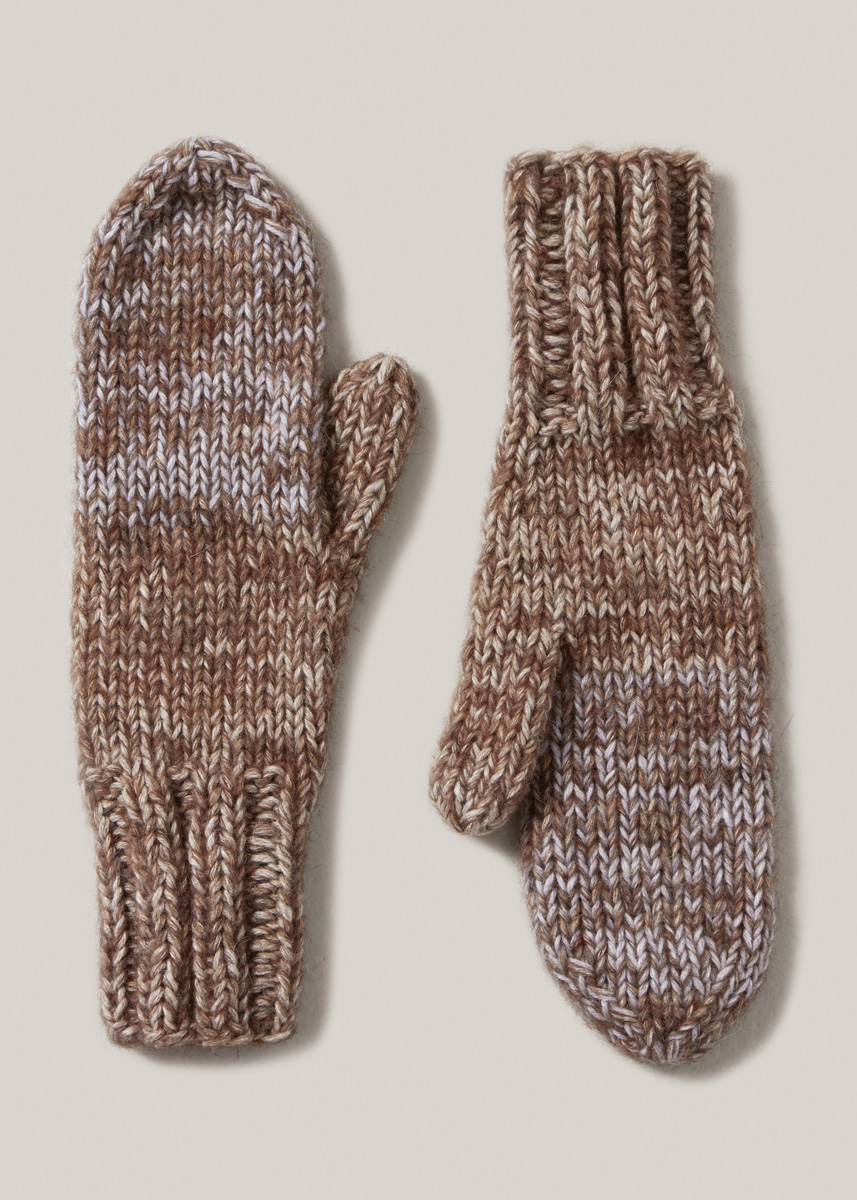 Lana Grossa-kvalitet „Cara” (57 % (baby) alpacka, 33 % bomull, 10 % ren ny ull (merino), löplängd = ca. 120 m/50 g): ca. 50 g beige (färg 3) och ljusblå (färg 10) och Lana Grossa-kvalitet „Natural Alpaca Pelo” (63 % bomull, 31 % (baby) alpacka, 6 % ren ny ull (merino), löplängd = ca. 125 m/50 g): ca. 50 g mörkbrun melerad (färg 8); strumpstickor nr. 6, 1 ullnål från Lana Grossa.
