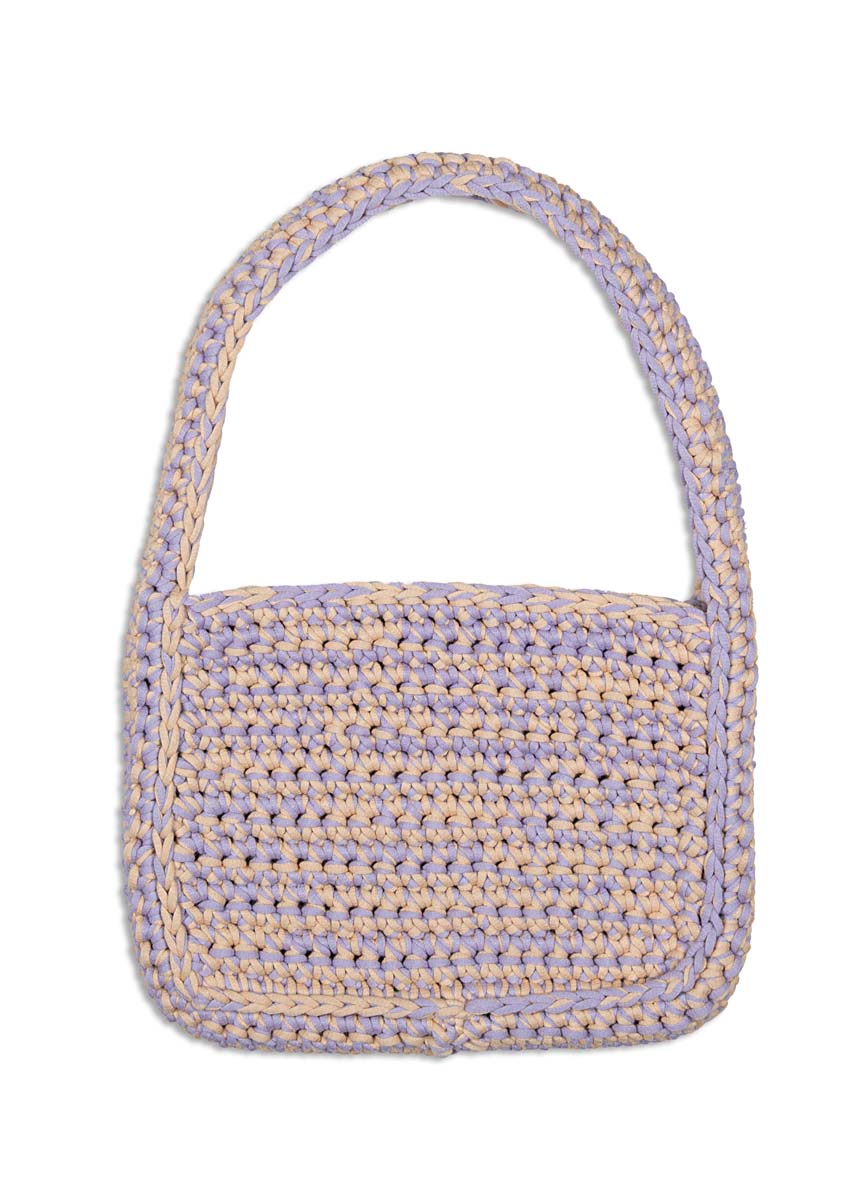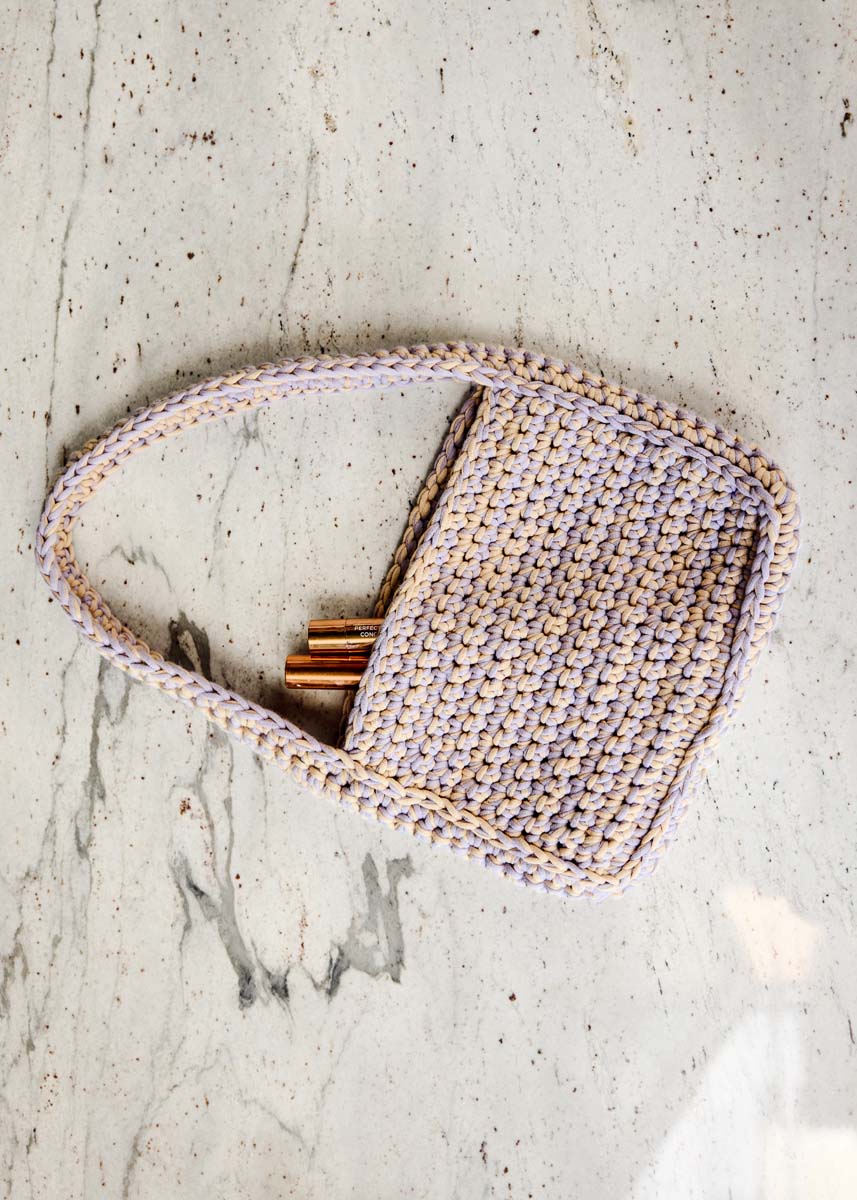 Lana Grossa-kvalitet „The Tube Fine” (68 % bomuld, 32 % polyamid, løbelængde = ca. 140 m/100 g): je ca. 100 g lilla (farve. 109) og beige (farve. 125); 1 uldhæklenål nr. 6. Tip: Det hele hækles med dobbelte tråde, med 1 tråd af hver farve!
