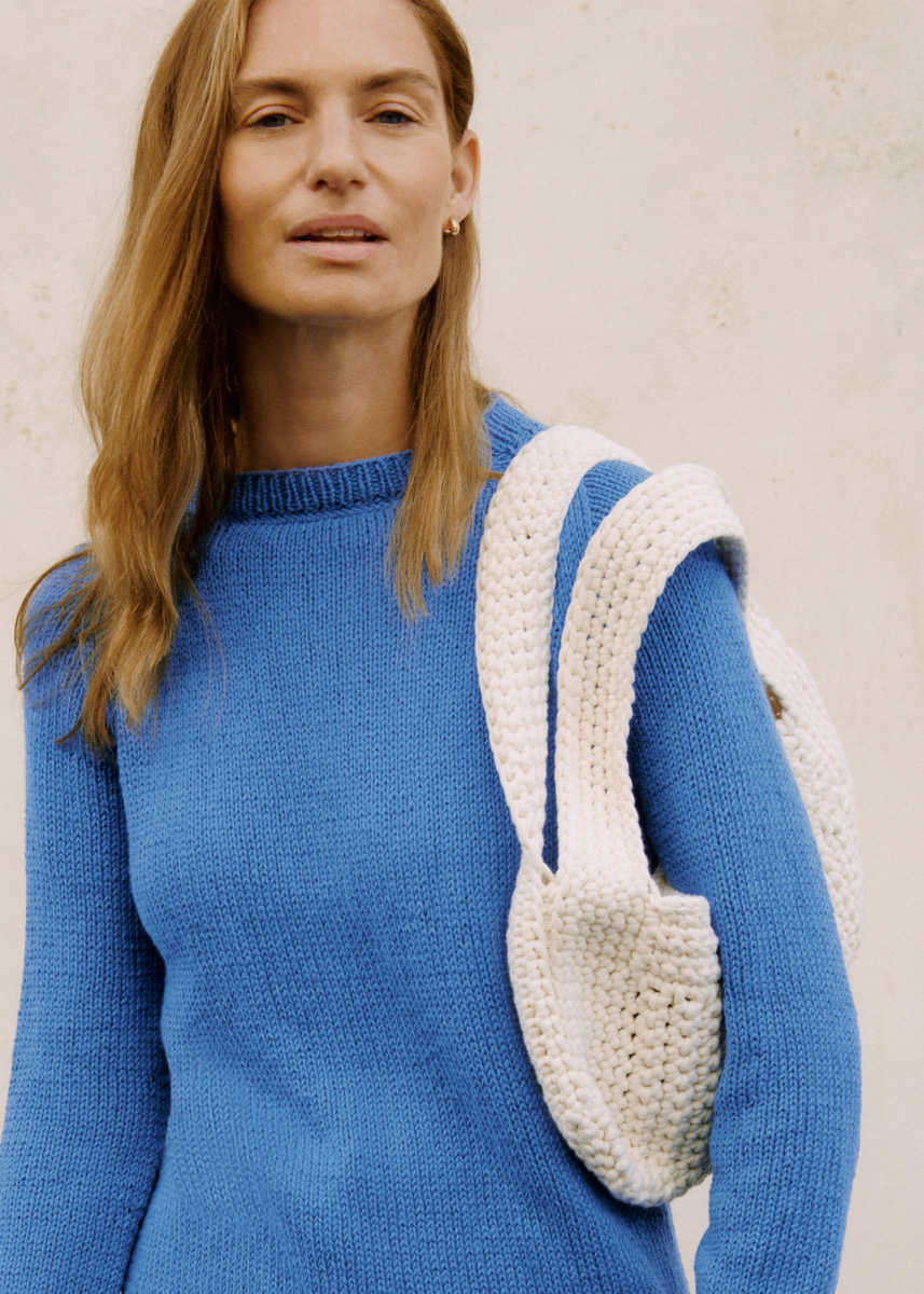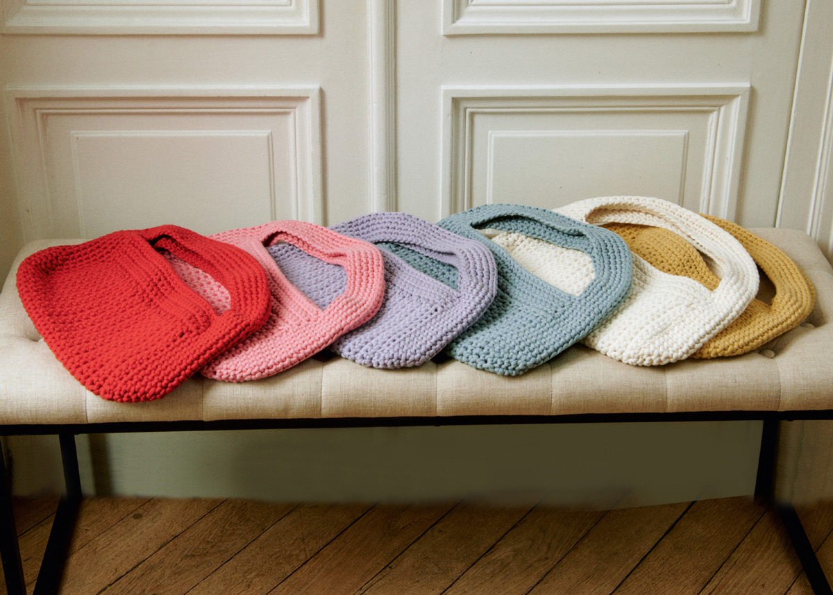 Lana Grossa-kvalitet „The Tube“ (60 % bomull, 40 % nylon, löplängd = ca 114 m/200 g): ca 400 g creme (färg 2) eller gul (färg 4) eller rosa (färg 3) eller röd (färg 7) eller lila (färg 9) eller mint (färg 10); 1 virknål nr. 7 och 8.