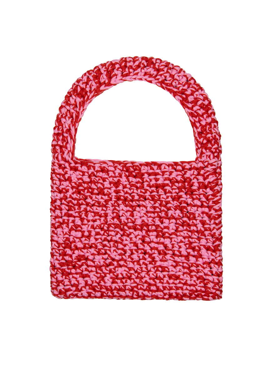 Lana Grossa-kvalitet ”The Tube” (60 % bomuld, 40 % nylon, løbelængde = ca. 114 m / 200 gr): ca. 400 gr rød (fv 7) og rosa (fv 19), hæklenål nr. 8. Tasken hækles med dobbelt garn – 1 tråd af hver farve.