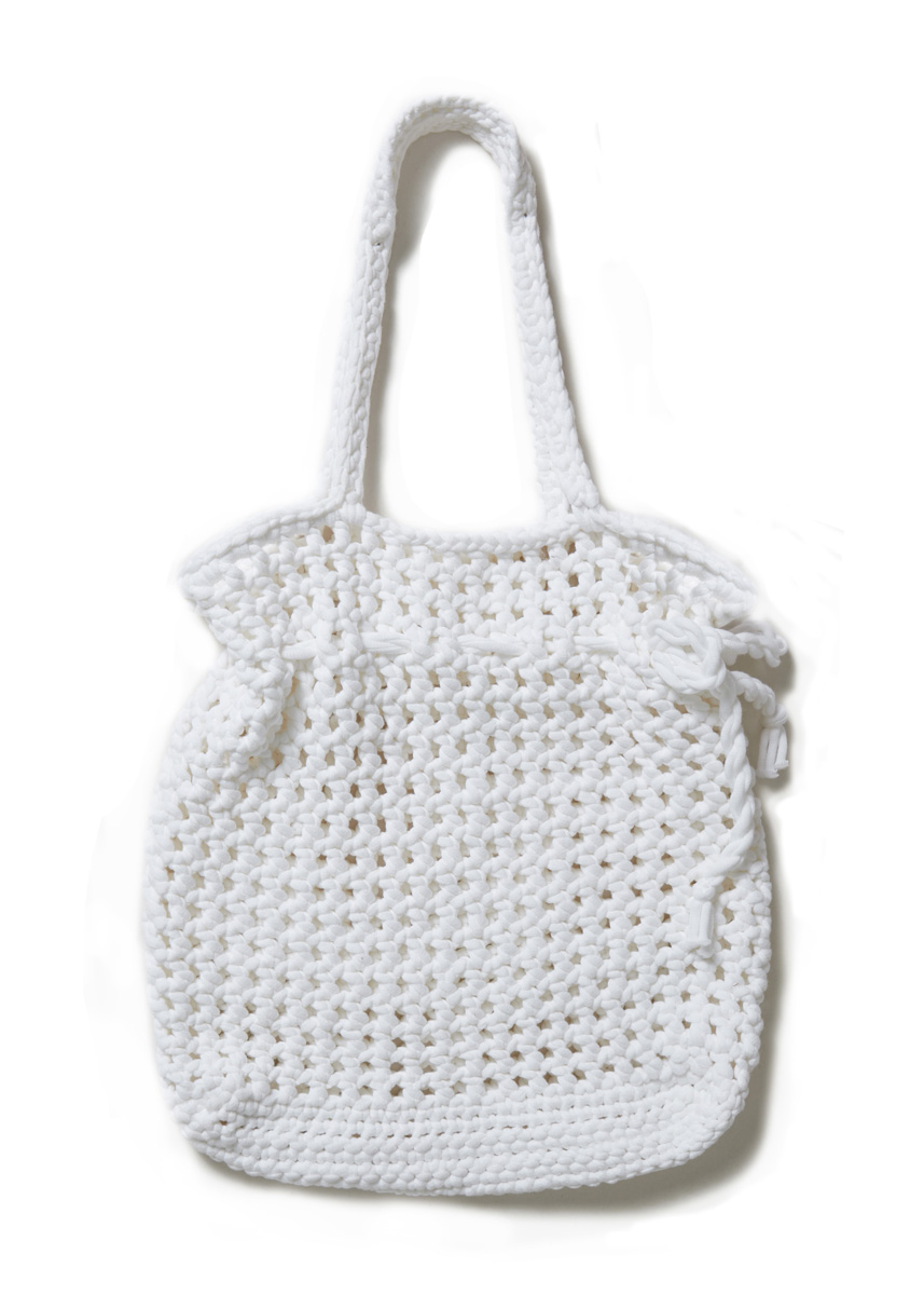 Lana Grossa-kvalitet „The Tube“ (60 % bomull, 40 % nylon, löplängd = ca. 114 m/200 g): ca. 400 g i vit (färg 1); 1 virknål nr. 6 och nr. 7.