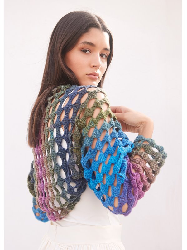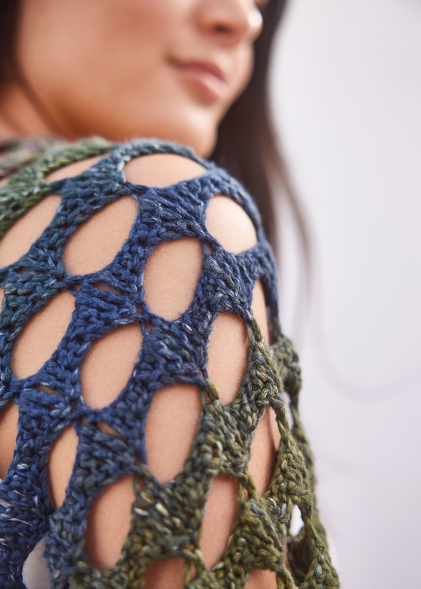 Lana Grossa-kvalitet „Cotonella“ (100% bomull (Pima), löplängd = ca 280 m/100 g): 3 (3 - 4 - 4) nystan = ca 300 (300 - 400 - 400) g moos-/blågrön/svartgrön/oliv/rödviolett/blåviolett/sjögrön (färg 8); virknål nr. 3,5.