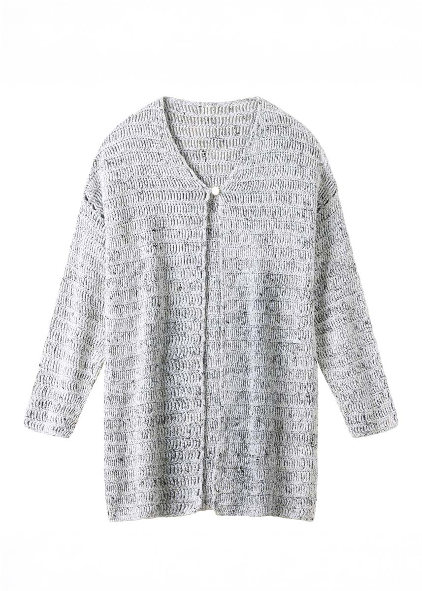 Lana Grossa-kvalitet „Maglia” (92 % bomull, 8 % polyester, løpelengde = ca. 155 m/50 g): ca. 550 (600 – 650) g hvit/svart/creme (farge 10); 1 heklenål nr. 3,5; 1 perlemorknapp i natur, ø 16 maskemarkør.