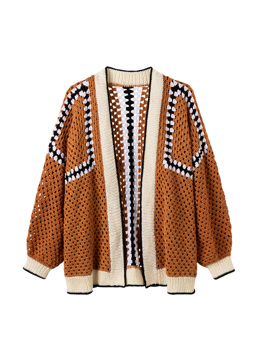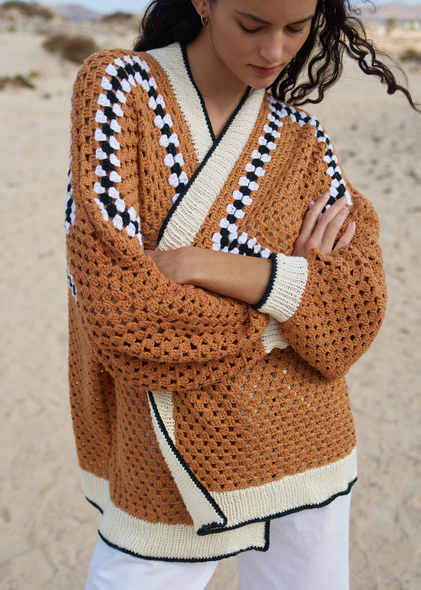 Lana Grossa-kvalitet ”Soft Cotton” (70 % bomuld, 30 % akryl, løbelængde = ca. 140 m / 50 gr): ca. 600 gr camel (fv 43), ca. 100 gr hvid (fv 10) og ecru (fv 2) og ca. 50 gr sort (fv 34), hæklenål nr. 3½, rundpind nr. 3, 80 cm.