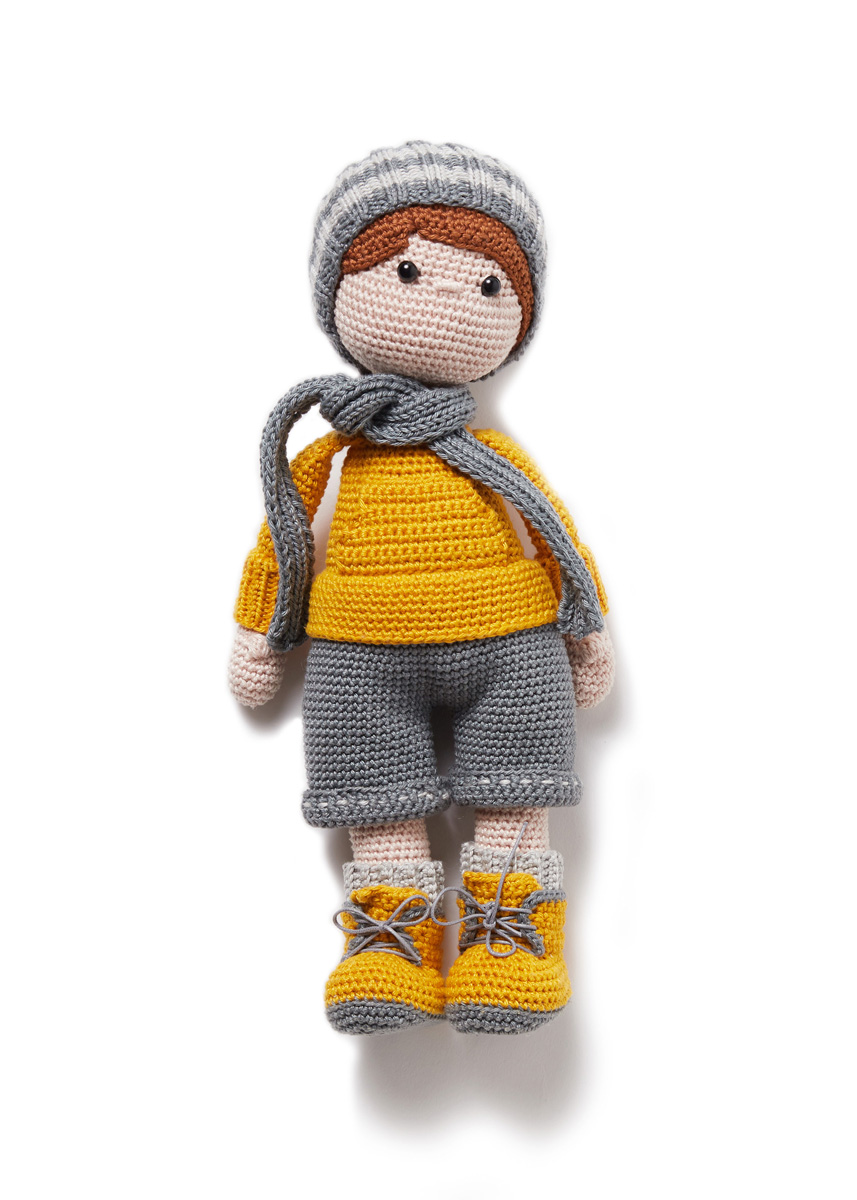 Lana Grossa-kvalitet ”Cotone” (100 % bomuld), løbelængde = ca. 125 m / 50 gr.): 50 gr fersken (fv 56), gyldengul (fv 38), brun (fv 37), mørkegrå (fv 19) og lysegrå (fv 27), hæklenål nr. 3, strømpepinde nr. 2 og 2½, sikkerhedsøjne 6 mm Ø, vasket bomuldssnor 1½ mm Ø i grå, fyldvat.