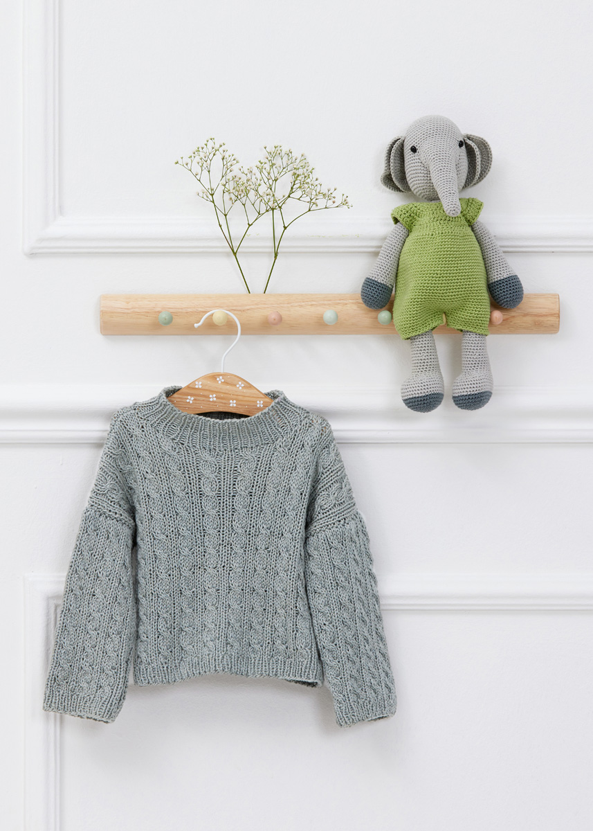 Lana Grossa-kvalitet ”Cotone” (100 % bomuld, løbelængde = ca. 125 m / 50 gr.): 150 gr lysegrå (fv 27), 50 gr mørkegrå (fv 19) og 100 gr lindegrøn (fv 73), hæklenål nr. 3 og 3½, 2 sikkerhedsøjne 6 mm Ø, træperle 10 mm Ø i grøn, fyldvat.