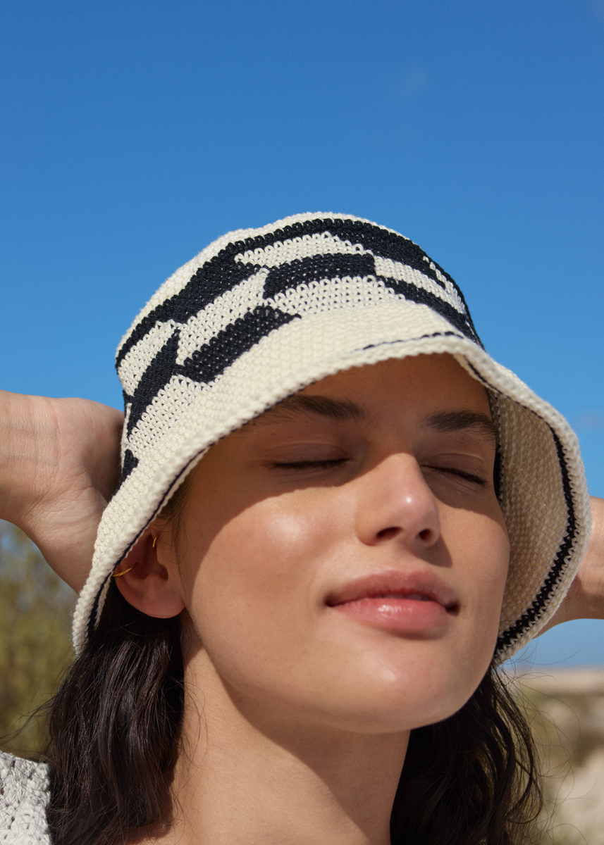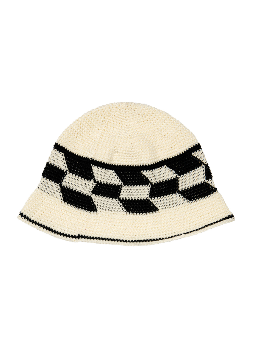Lana Grossa-kvalitet ”Cotone” (100 % bomuld, (kæmmet, gasset, merc.), løbelængde = ca. 125 m / 50 gr): ca. 100 gr råhvid (fv 28) og ca. 50 gr sort (fv 21), hæklenål nr. 4
