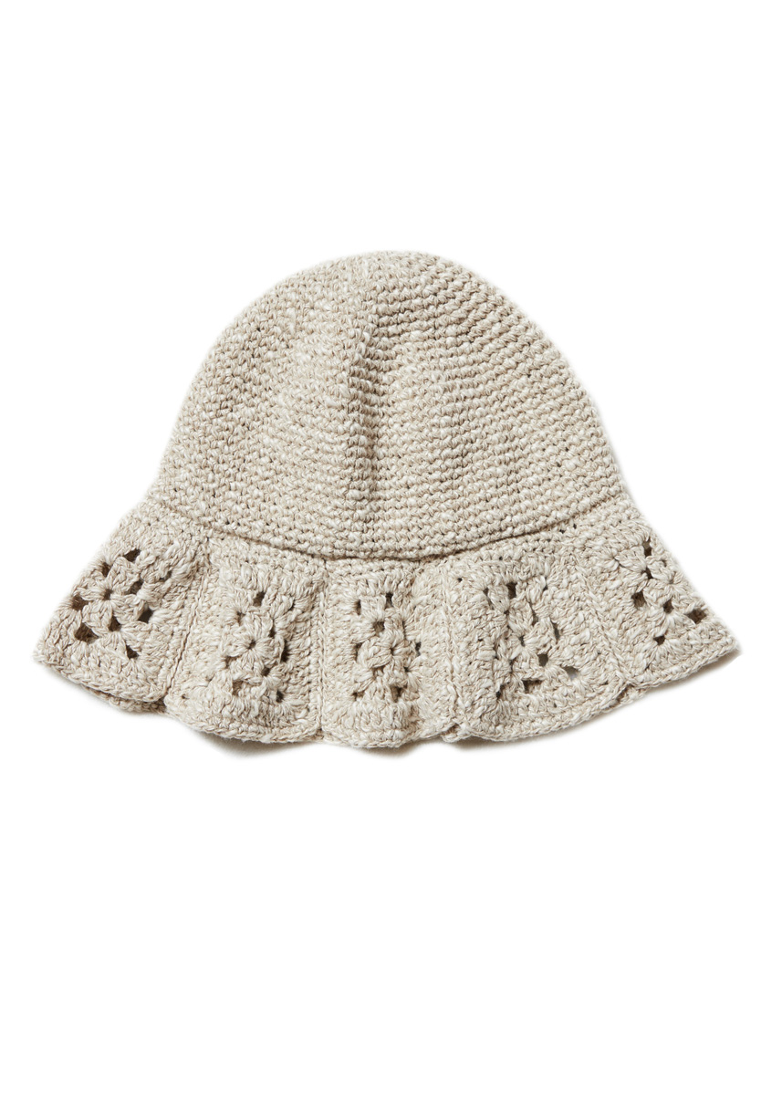 Lana Grossa-kvalitet „Terra“ (58 % hør, 42 % bomuld, løbelængde = ca. 170 m / 50 gr.): ca. 150 gr sand (fv 17), hæklenål nr. 4, stoppenål fra Lana Grossa. Bemærk: Hatten hækles med dobbelt garn.