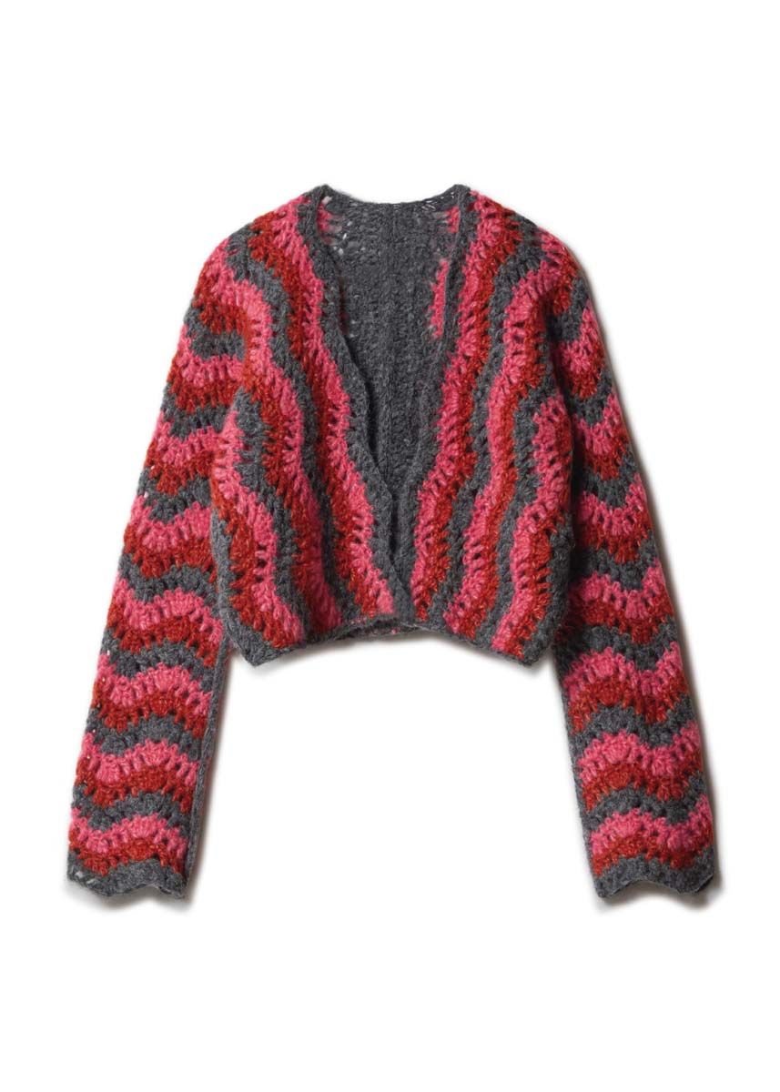Lana Grossa Alpaca Air (62% alpakka (baby), 27% polyamid, 11% ren ny ull (fin merino), løpelengde 140 m/50 g), 100 g hver i pink (farge 7), rustrød (farge 19) og 150 g antrasitt (farge 11); 1 heklenål nr. 6 og nr. 7.