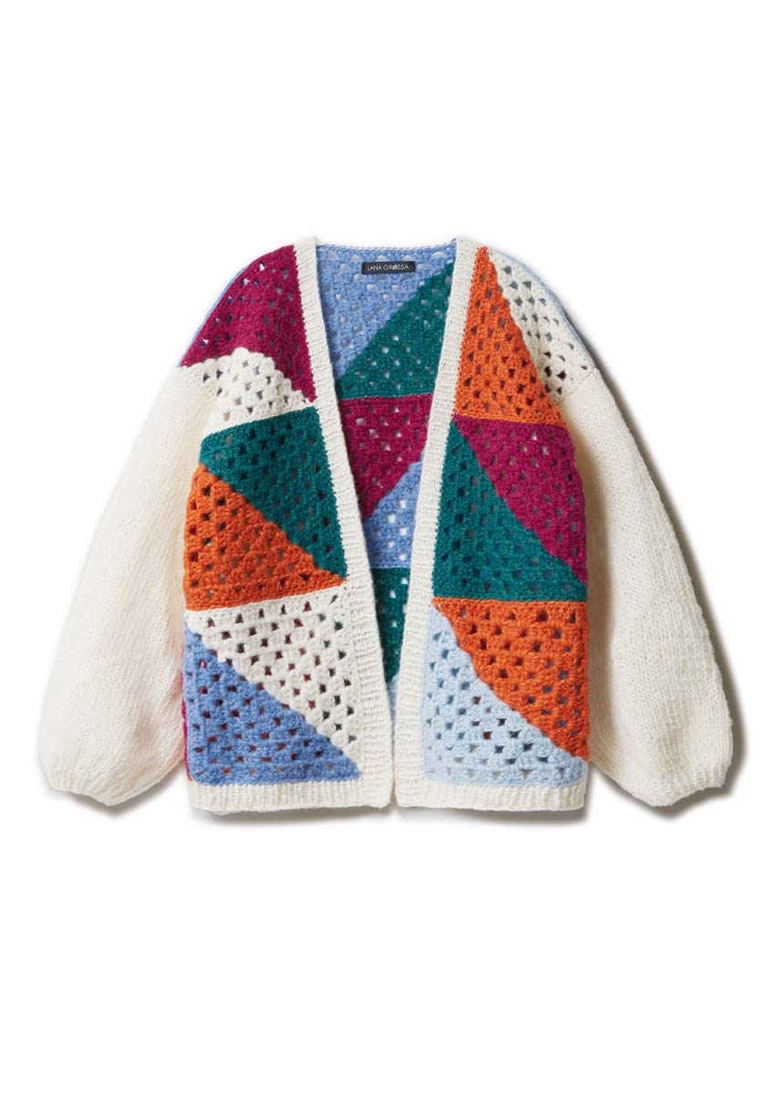 Lana Grossa Brigitte No. 2 (47% (baby) alpakka, 45% bomull, 8% ren ny ull, løpelengde 140 m/50 g), 250 g råhvit (farge 16) og 50 g hver i mandarin (farge 45), fuchsia (farge 38), lysende blå (farge 65), asurblå (farge 64) og opalgrønn (farge 50); 1 heklenål nr. 6, 1 rundpinne nr. 5, 80 cm lang.