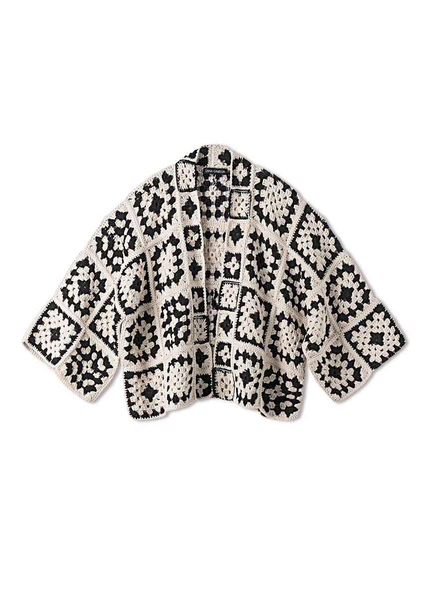 Lana Grossa-kvalitet „Campo” (65 % bomull, 25 % viskose, 10 % lin, løpelengde = ca. 125 m/50 g): ca. 800 g creme (farge 2) og ca. 350 g svart (farge 24); 1 heklenål nr. 5. Tips: Alle bestemorruter hekles med dobbel tråd i respektive farge.