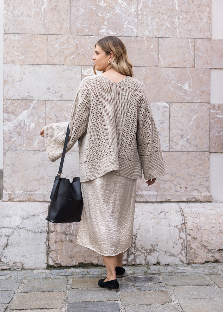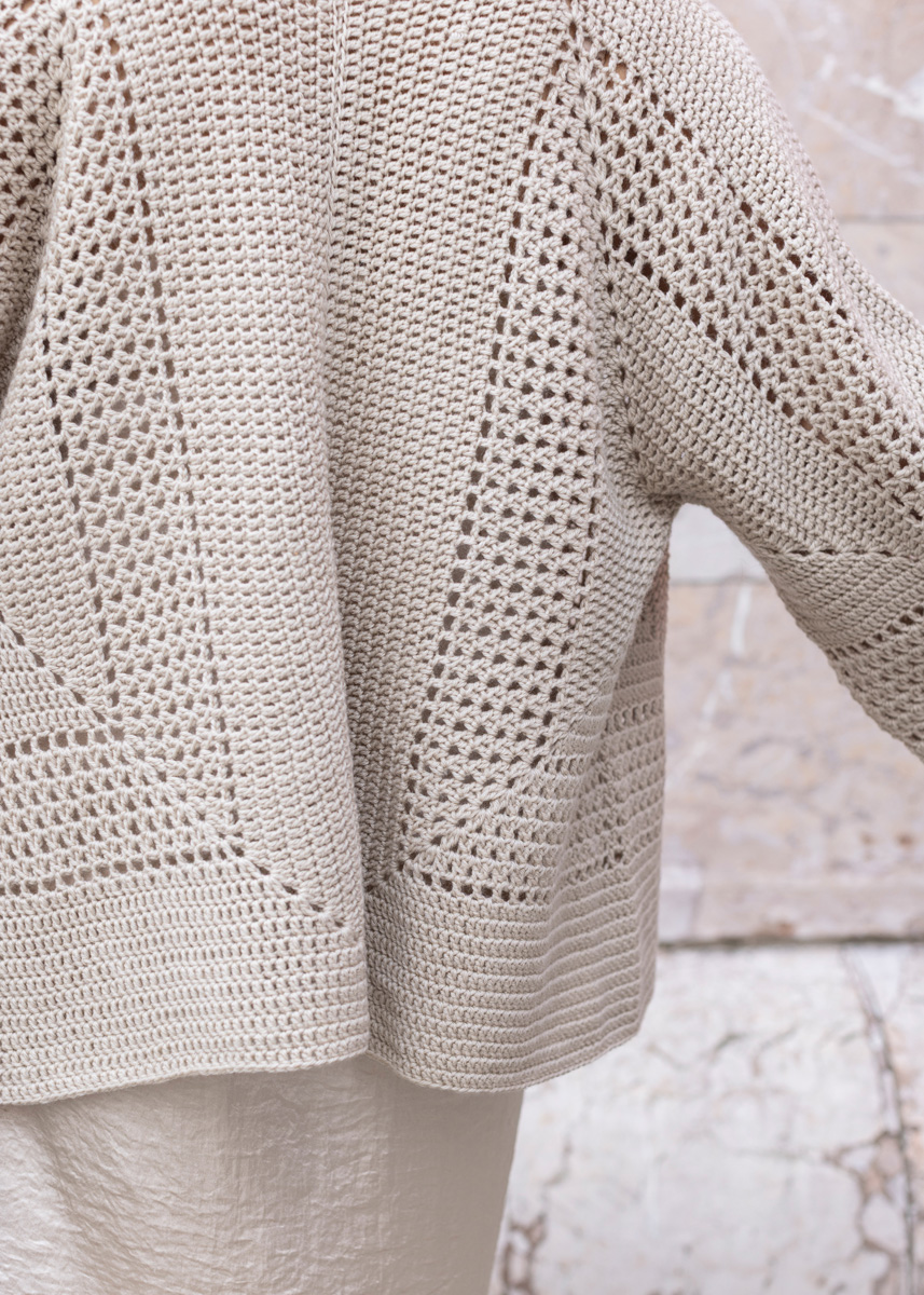 Jackan består av två sexkanter som virkas runt, med utgångspunkt i armhålan. Modellen har en totallängd på 58 (62 - 67) cm och en bröstövervidd på 36-28 cm vid 80-88 cm bröstomkrets (36-28 cm vid 96-104 cm bröstomkrets - 36-24 cm vid 116-128 cm bröstomkrets).