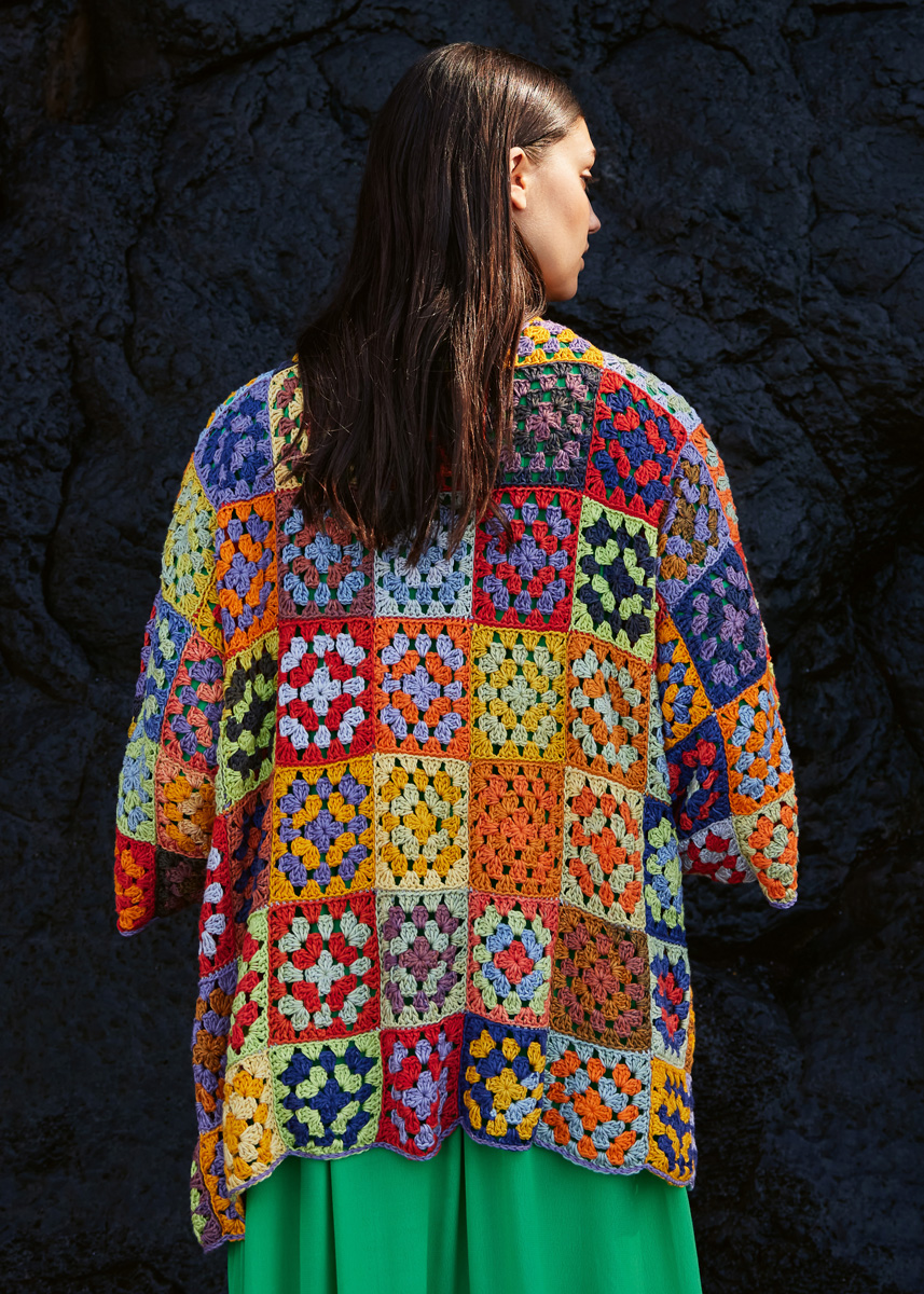 Lana Grossa-kvalitet „Gomitolo Aloha“ (50 % bomull, 50 % viskos, löplängd = ca. 250 m/100 g): ca. 400 g äggulegul/curry/orange/violett/grålila/kanel/gulgrön (färg 316) och ca. 400 g persika/orange/pumpa/gråblå/blåviolett/mokka (färg 317); virknål nr. 4.