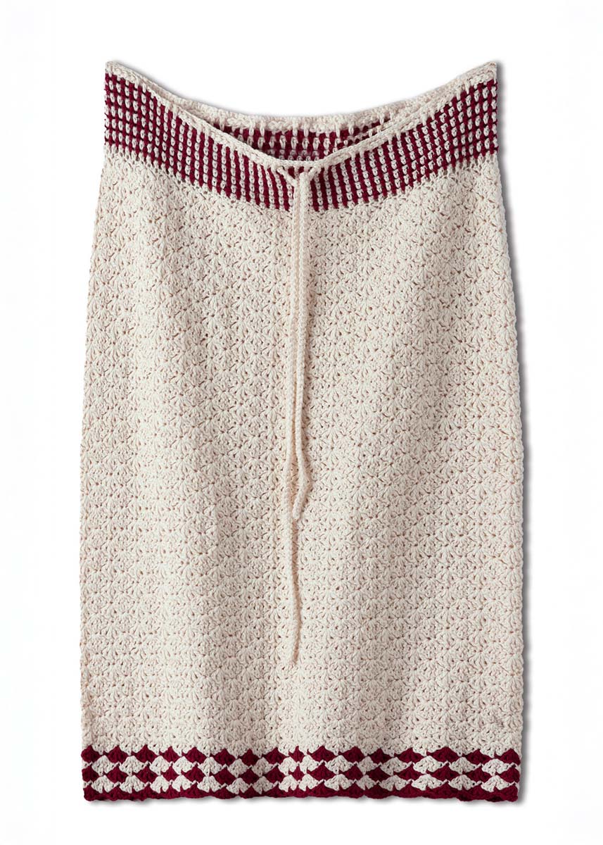 Lana Grossa-kvalitet „Campo” (65 % bomull, 25 % viskose, 10 % lin, løpelengde = ca. 125 m/50 g): ca. 300 (350) g creme (farge 2) og ca. 50 g burgunder (farge 26); 1 heklenål nr. 3,5.