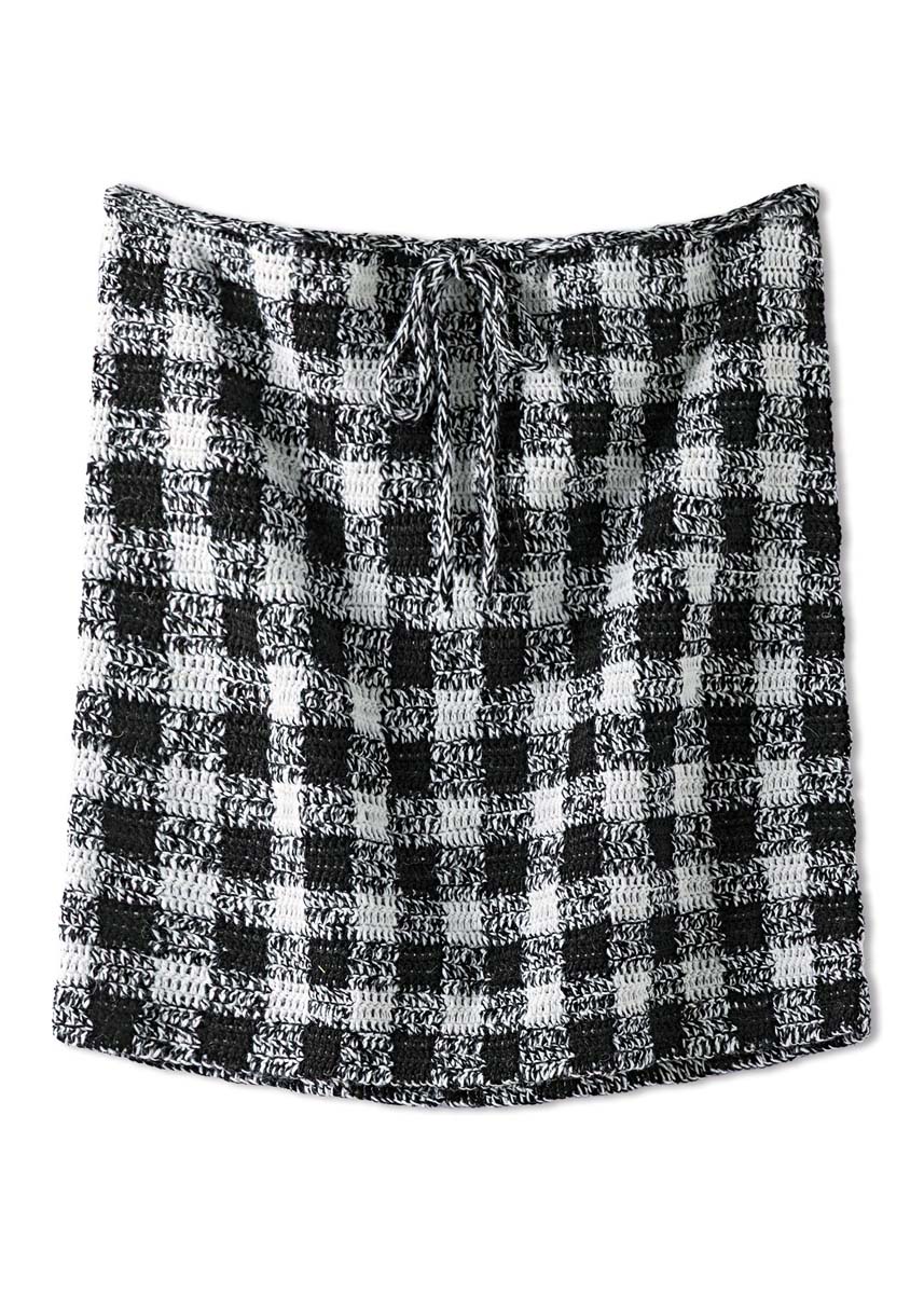 Lana Grossa-kvalitet „Solo Lino” (80 % res. lin (viskose), 20 % lin, løpelengde = ca. 120 m/50 g): ca. 350 (400) g svart (farge 14) og Lana Grossa-kvalitet „Ecopuno” (72 % bomull, 17 % ren ny ull (merino), 11 % (baby) alpakka, løpelengde = ca. 215 m/50 g): ca. 150 (200) g hvit (farge 26); 1 heklenål nr. 2,5, 2 settpinner nr. 5.