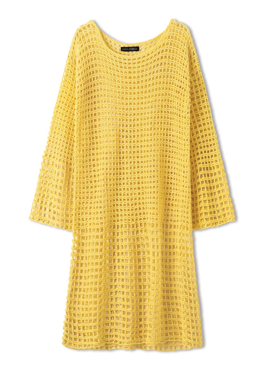 Lana Grossa-kvalitet „Alta Moda Cotolana” (45 % ren ny ull (merino), 45 % (Pima) bomull, 10 % polyamid, løpelengde = ca. 150 m/50 g): ca. 450 (500) g lysegul (farge 61); 1 heklenål nr. 3,5.