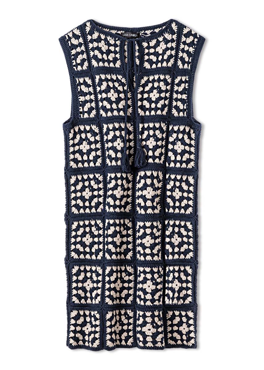Lana Grossa-kvalitet „Elastico” (96 % bomull, 4 % polyester (Elité), løpelengde = ca. 160 m/50 g): ca. 400 g nattblå (farge 12) og ca. 250 g beige (farge 97); heklenål nr. 3,5 og 4.