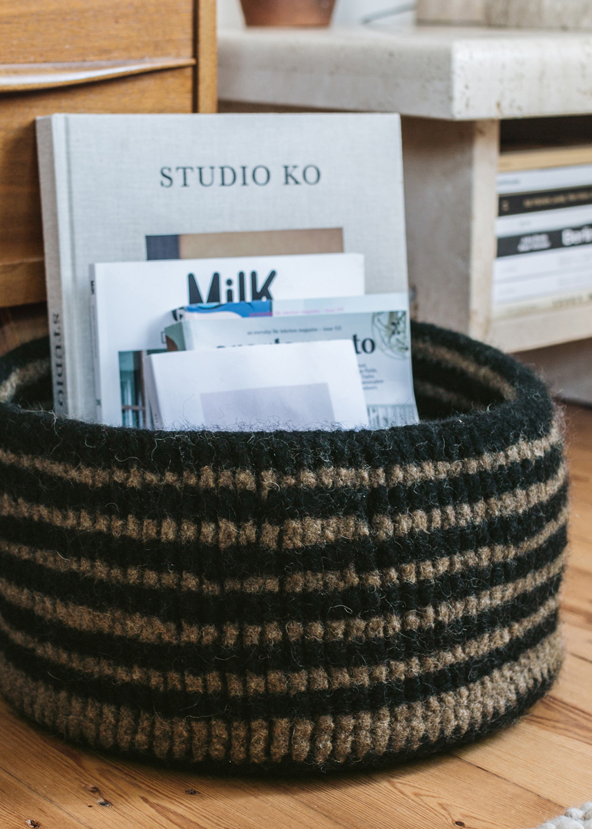 Lana Grossa-kvalitet „Feltro“ (100 % ren ny ull, löplängd = ca 50 m/50 g): ca 600 g svart (färg 6), ca 400 g brun (färg 23); virknål nr. 10. Korgen virkas runt med dubbla trådar i samma färg.