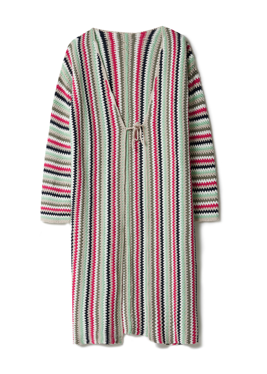 Lana Grossa „Elastico“ (96% bomull, 4% polyester (Elité), löplängd 160 m/50 g), 250 (300 – 300) g beige (färg 97), 200 (250 – 250) g ecru (färg 36), 150 (200 – 200) g ljusgrön (färg 159), 100 (150 – 150) g cyclamen (färg 144), 100 (150 – 150) oleandergrön (färg 156) och 100 (150 – 150) nattblå (färg 12); 1 virknål nr. 4.