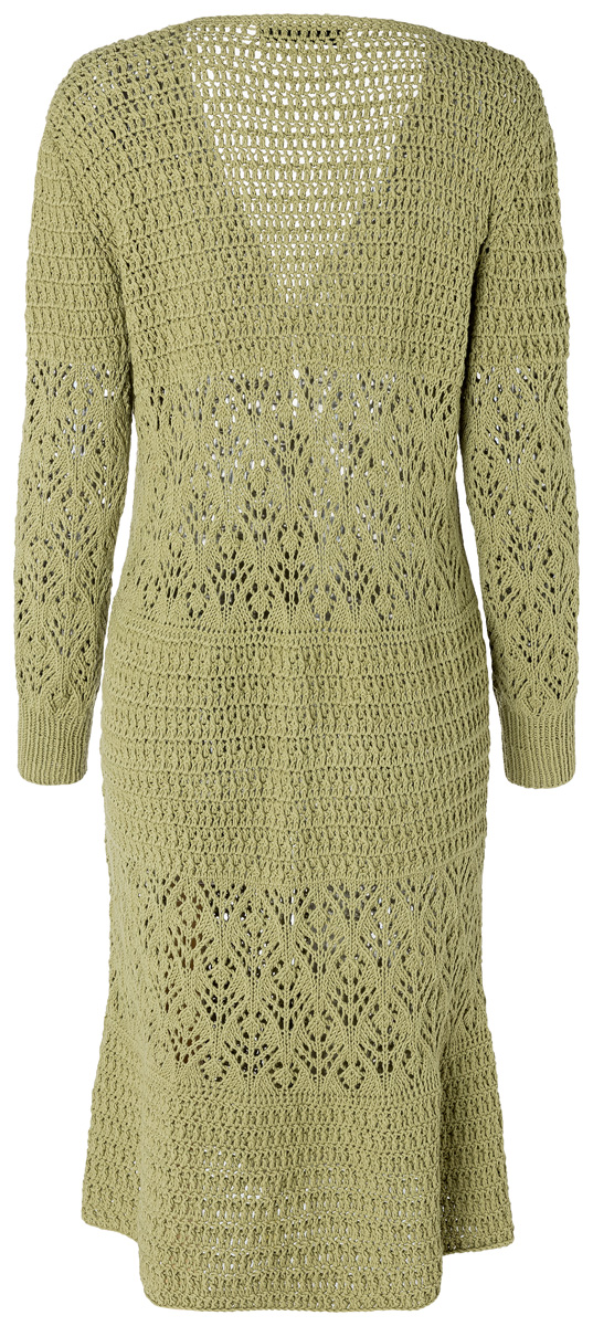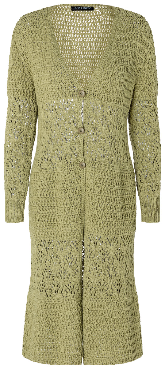 Lana Grossa-kvalitet „Elastico” (96 % bomull, 4 % polyester (elité), löplängd = ca. 160 m/50 g): ca. 650 g högrön (färg 166); ullvirknålar nr. 3,5, 4 och 4,5, stickor nr. 3,5, 4 och 4,5; 3 passande knappar, ø 20 mm.