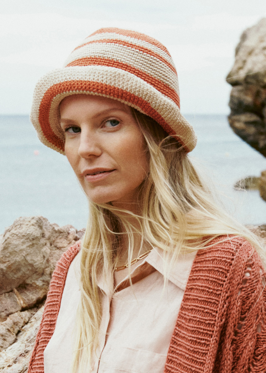 Lana Grossa-kvalitet „Organico“ (100 % bomuld, løbelængde = ca. 90 m / 50 gr.): ca. 100 gr beige (fv 100) og ca. 50 gr kanel (fv 140) hæklenål nr. 4.