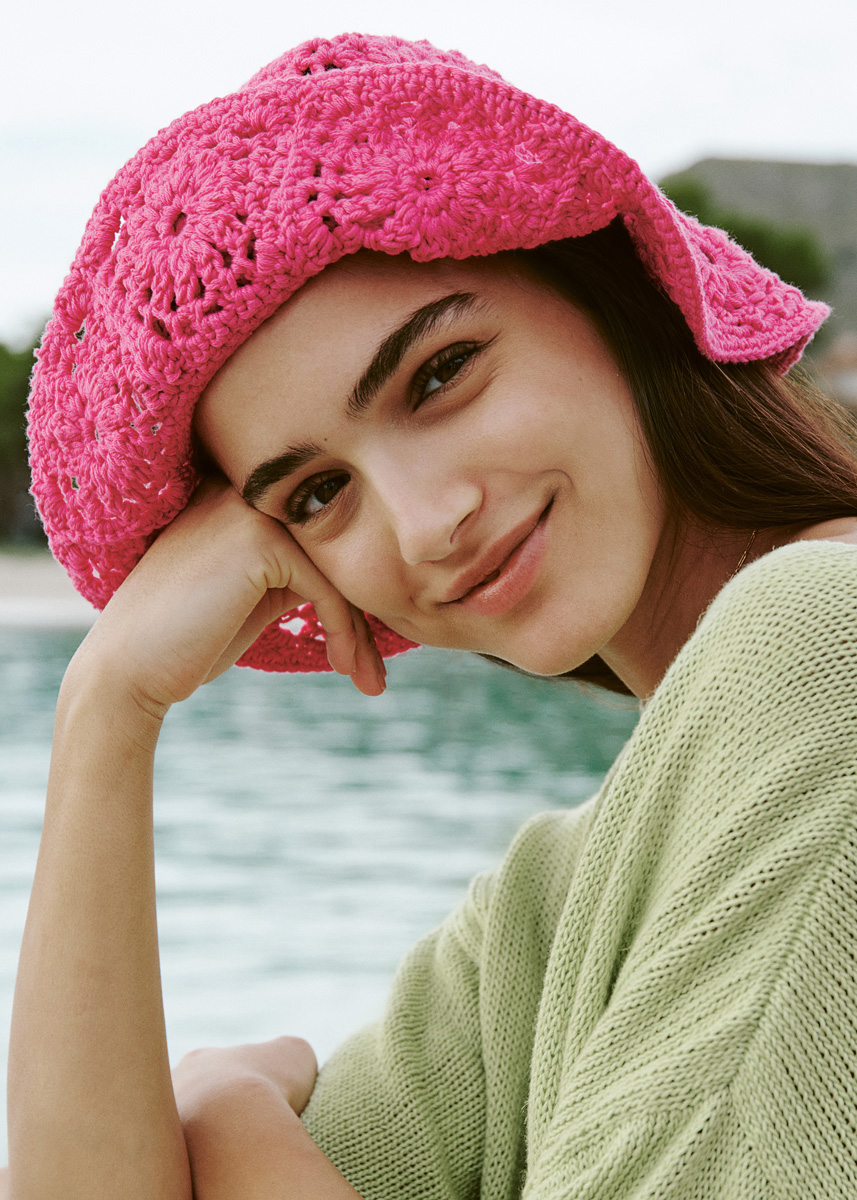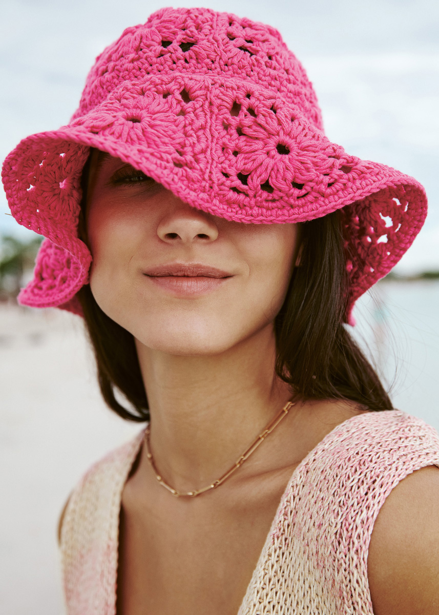 Lana Grossa-kvalitet „Organico“ (100 % bomuld, løbelængde = ca. 90 m / 50 gr.): ca. 150 gr pink (fv 98), hæklenål nr. 5, ca. 200 cm tynd, bøjelig wire i passende farve, stoppenål fra Lana Grossa.